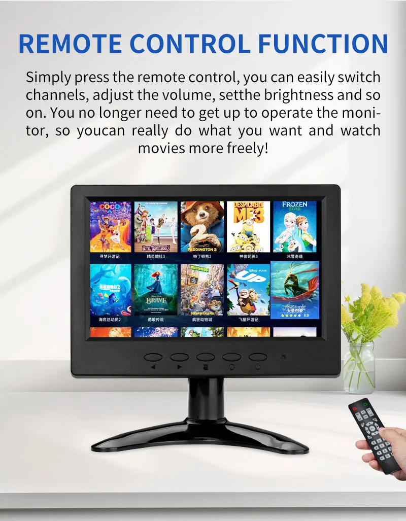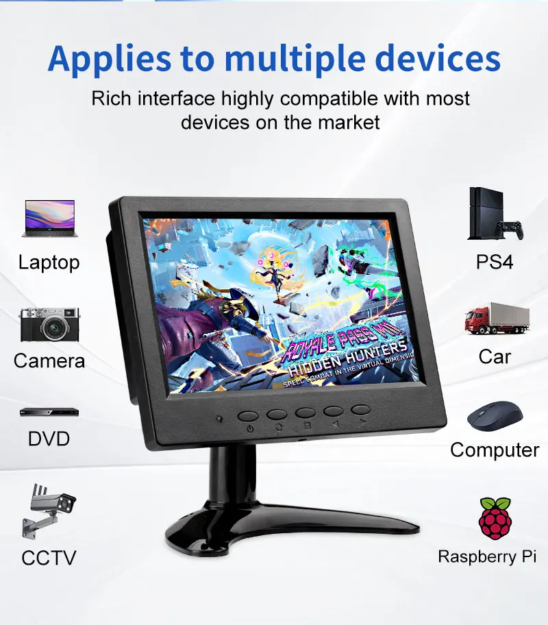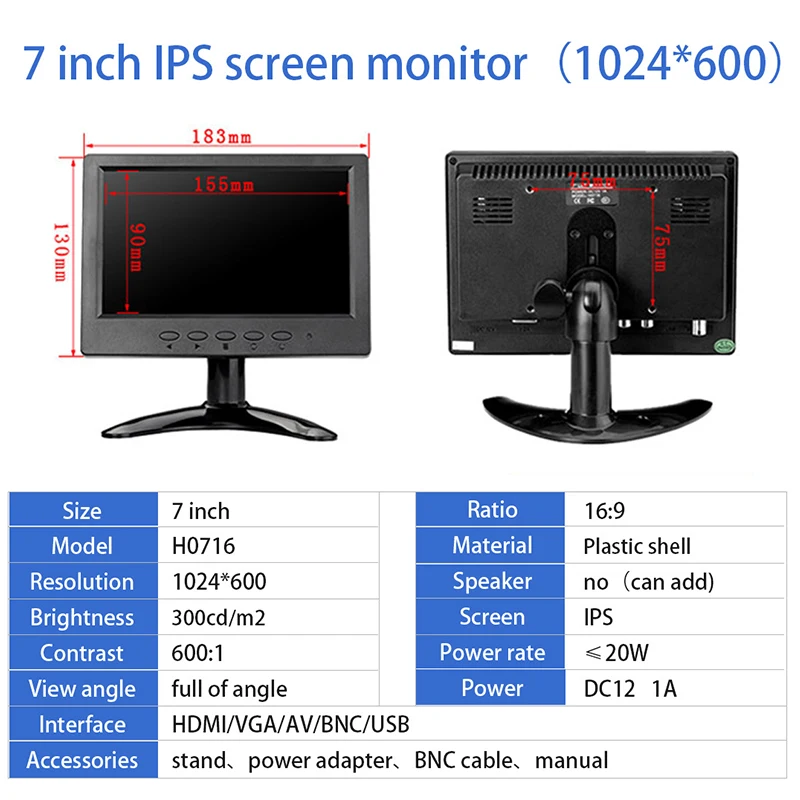 Las especificaciones del monitor de escritorio 16:9 IPS 1024*600 de 7 pulgadasMarcaZHIXIANDANúmero de modeloH0716Tamaño de pantalla7"MaterialPlásticoRelación de aspecto16:9Resolución1024 (RGB) * 600Brillo300 cd/m2Relación de contraste600:1Ángulo de visión Tiempo de respuesta25 (típico.)(Tr+Td) (ms)Frecuencia de fotogramas60 HzSistema de colorPAL/NTSCInterfazHD-MI/BNC/VGA/AV/USBPotenciaCC 12 V 1 A.EnchufeEnchufe AU, UE, EE. UU., Reino Unido disponibleIdiomas del menú