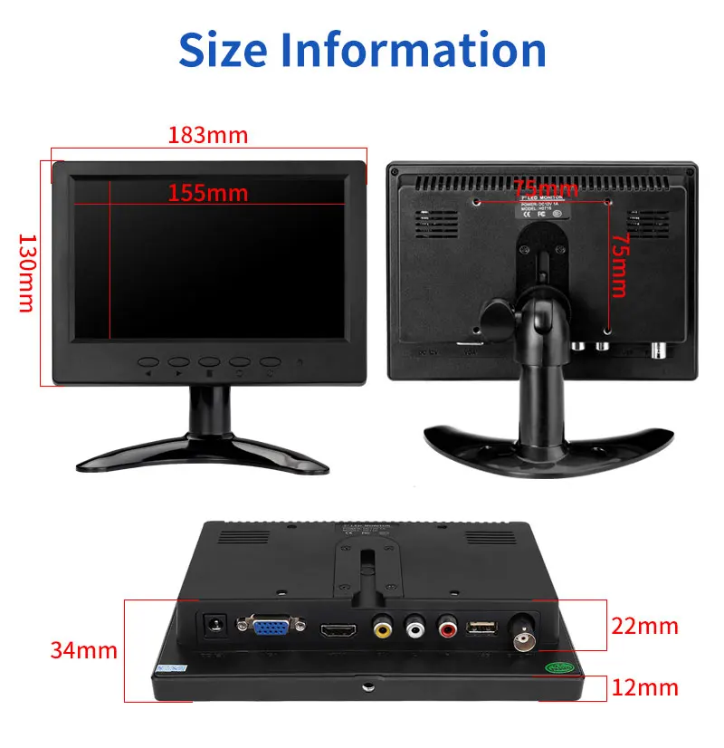 Tamaño del monitor183*130*34mmÁrea activa/área de visualización155*90mmDistancia del agujero VISA75*75mmTiempo de entregaMuestra: 1 ~ 3 días hábiles.10 ~ 100 unidades: 2 ~ 5 días hábiles.Más de 100 unidades: 5 ~ 15 días hábiles
