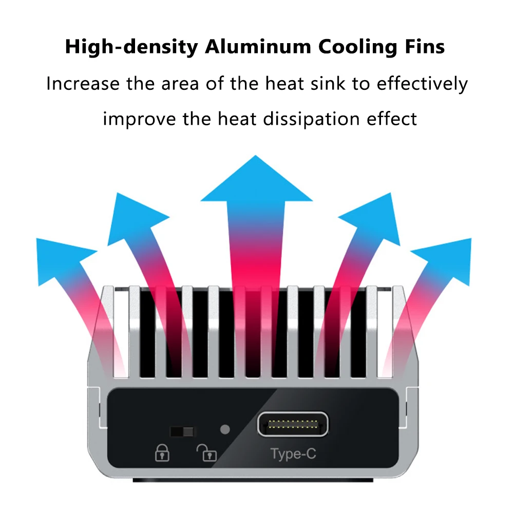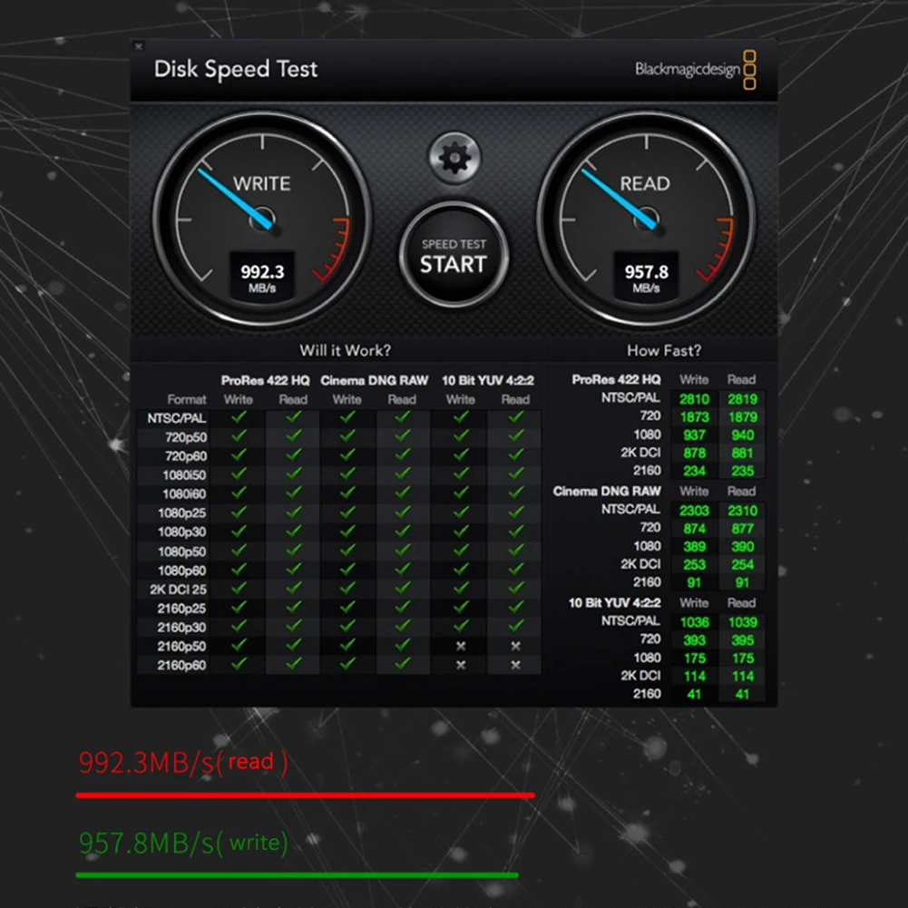 1. Transmisión de alta velocidad de 10Gbps:Chip principal JMS583 incorporado, transfiere archivos grandes de 1GB en segundos. Velocidad de transmisión de 10Gbps, la velocidad de lectura y escritura medida puede alcanzar los 992 MB/S.