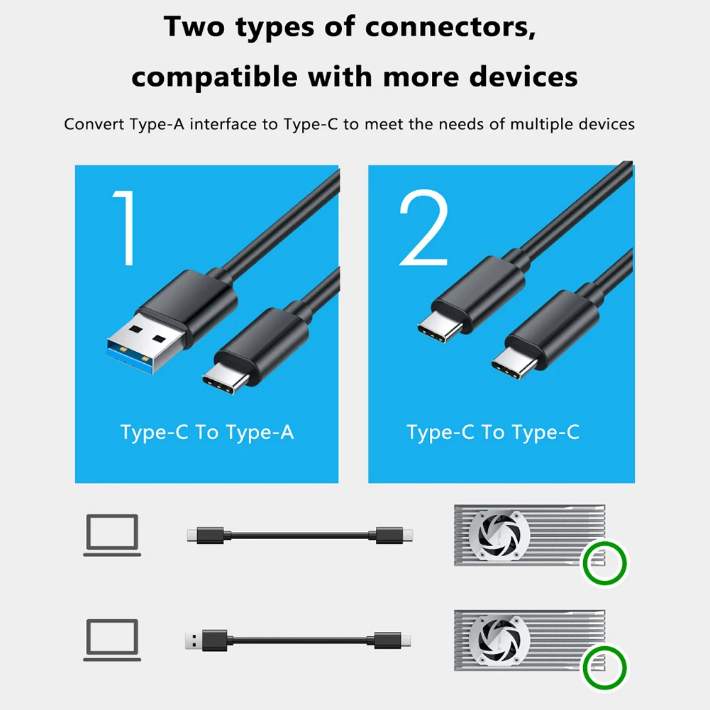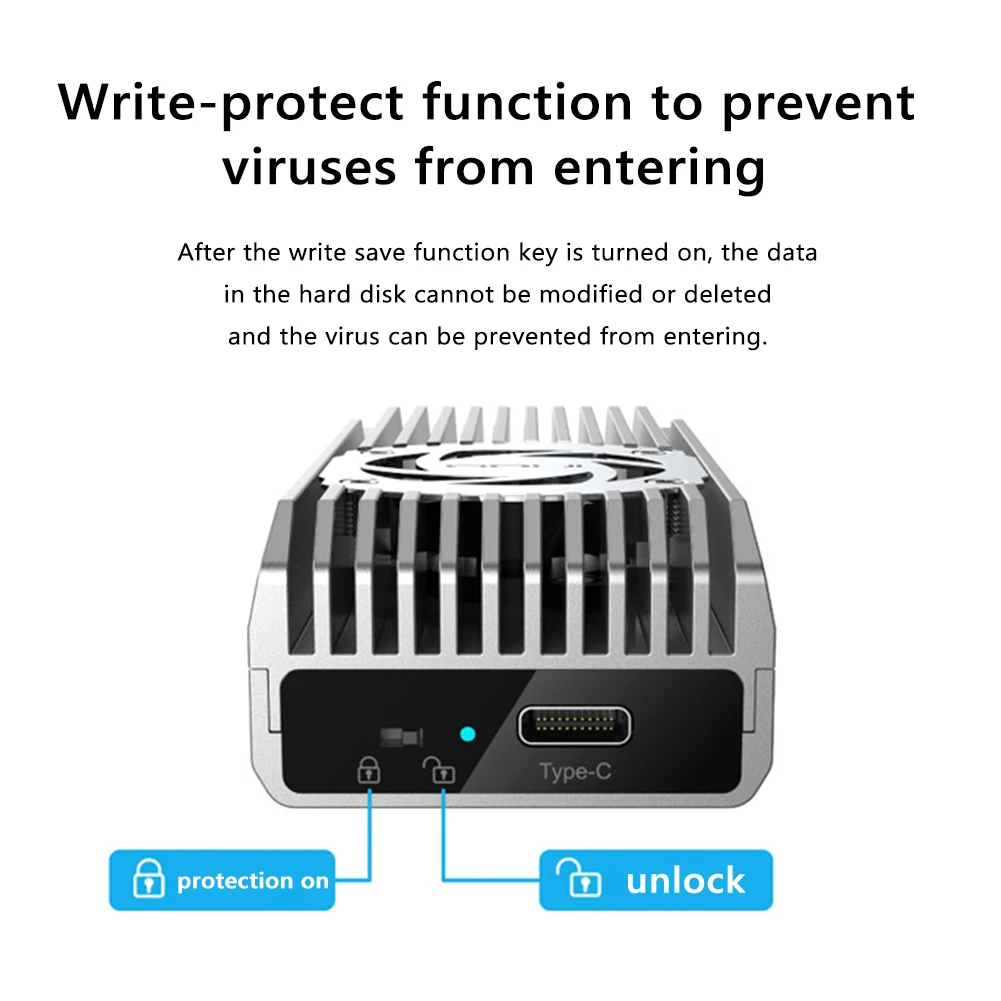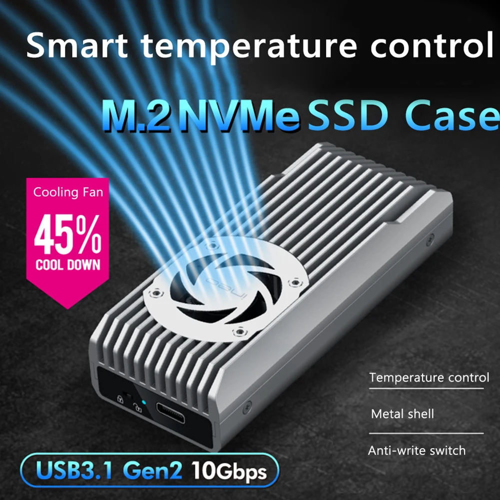 10Gbps M.2 NVME Caja Ventilador de refrigeración incorporado M.2 NVME SSD Caja Protección de escritura USB3.1 Gen2 Tipo-C Soporte 2230 2242 2260 2280
