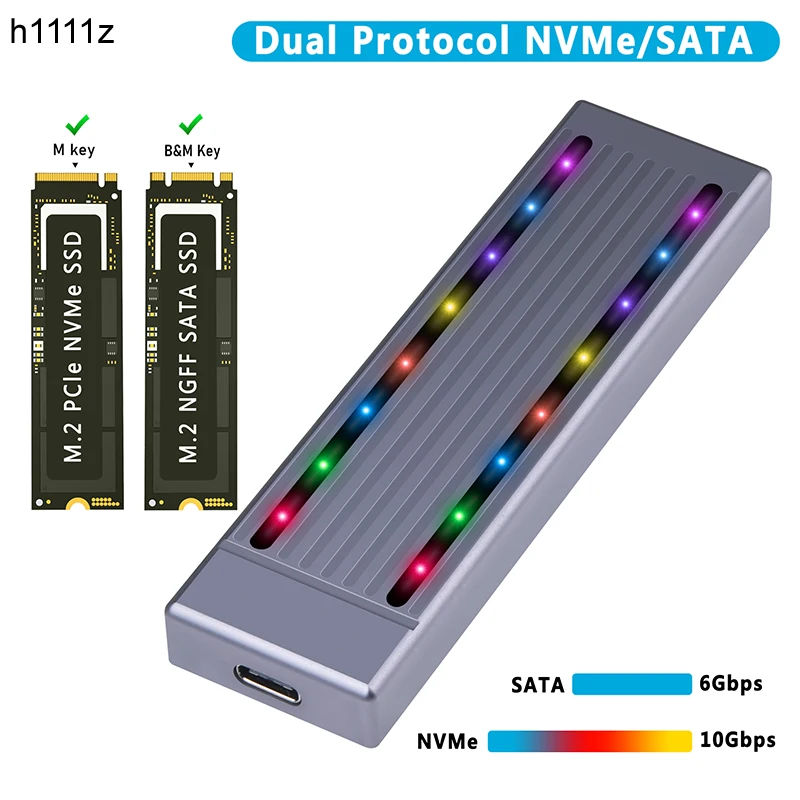 Comprar Carcasa de SSD de protocolo Dual, caja externa portátil para PC, NVME, M.2, SATA, RGB, LED, USB C 3,2, Gen2, NVMe, NGFF, 10G, PCIe, M2