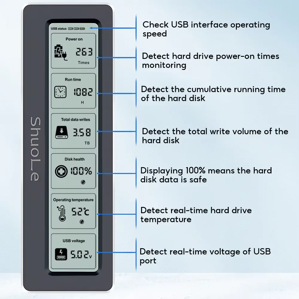 No es un mal truco, pero no lo recomiendo como funda SSD. Más: 1. Hay una pantalla que muestra todo tipo de números (actualizaciones ~ una vez por minuto). 2. La tapa trasera funciona como un radiador. Menos: 1. No hay ninguna declaración de "Bytes totales escritos" (hay una "capacidad de disco" inútil en su lugar) 2. trabaja intermitentemente. Nunca funcionó durante más de dos días, se apaga después de unas horas de funcionamiento, a pesar de que en otro caso sin pantalla, el mismo SSD trabaja de forma estable durante meses. Conclusión: un juguete de cebo, tal vez un hermoso regalo, pero ya no aceptaré este caso.