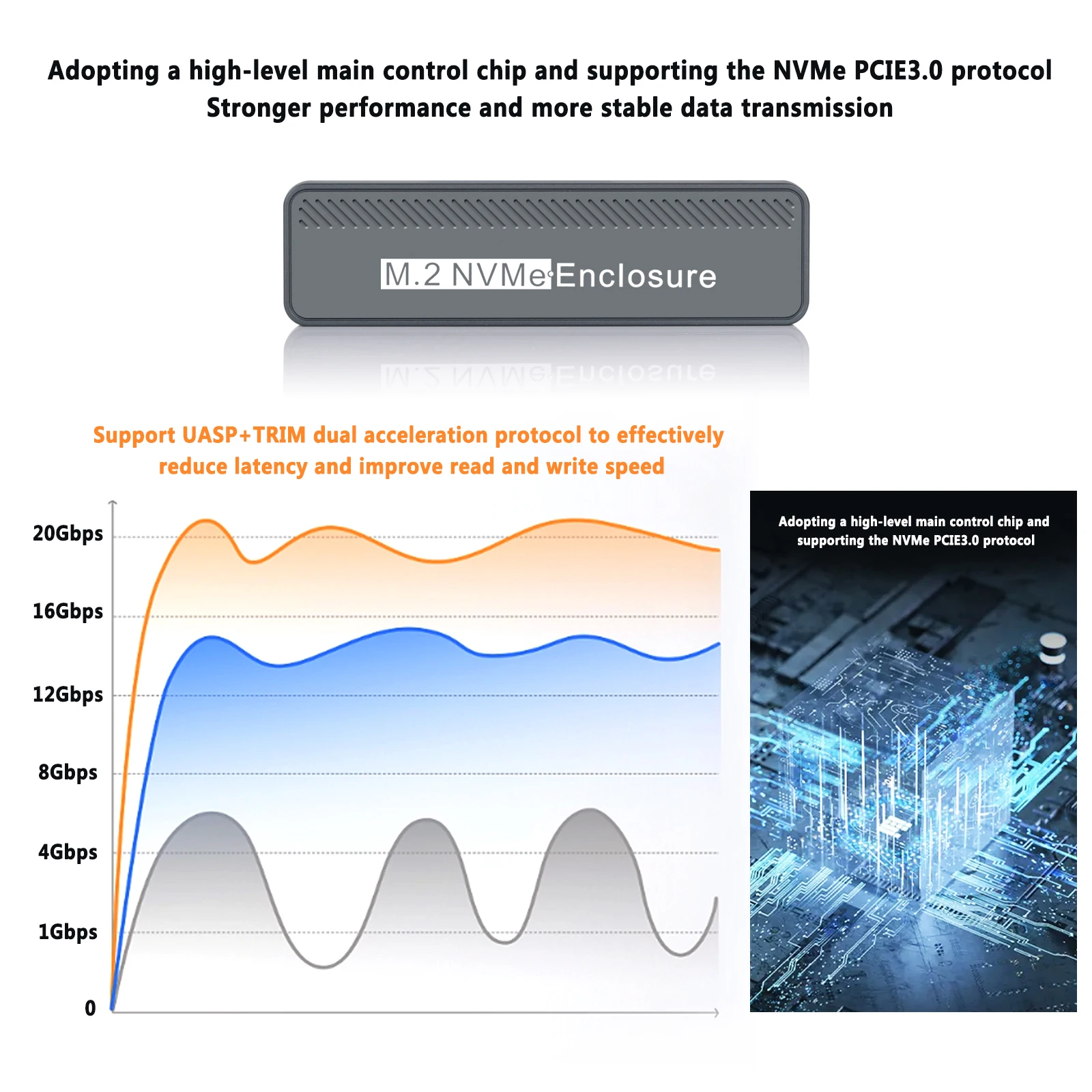 1. Caja de disco duro M.2 NVME SSD que admite velocidad USB3.2 20Gbps. Y puede soportar un ancho de banda de transmisión de hasta 20Gbps.