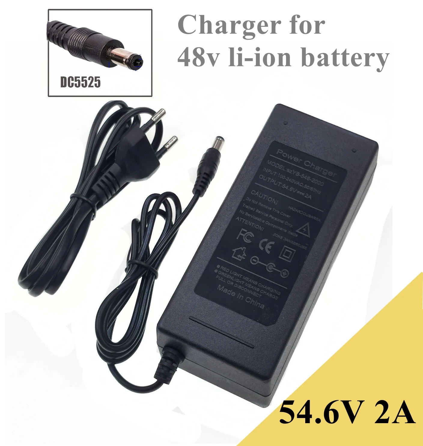 Comprar Cargador de 54,6 V 2A para batería de iones de litio de 48v, paquete de batería 13S 18650, conector DC5525