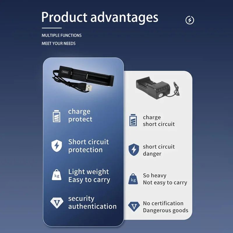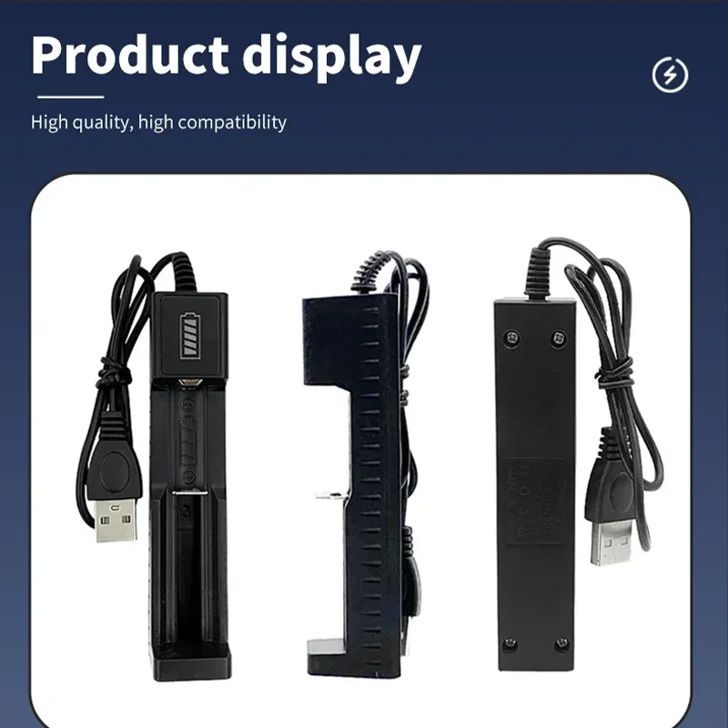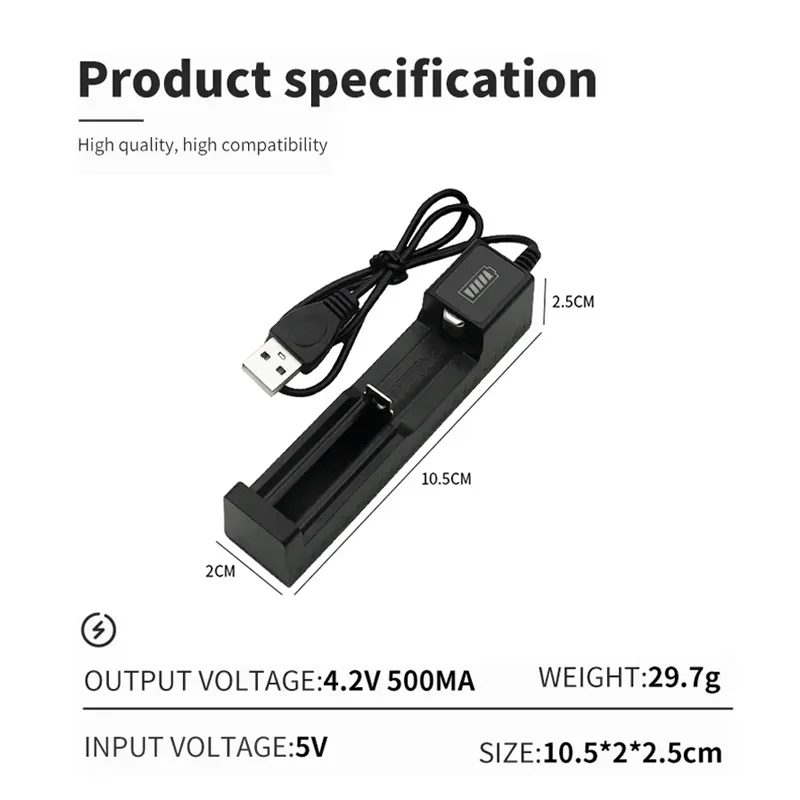 Característica:1. Carga USB.Viene con cable USB para cargar, bajo voltaje, seguro, se puede conectar a cargadores de teléfonos móviles.2.Resorte telescópico.El polo negativo de la ranura está diseñado con un resorte retráctil, que puede cargar baterías de litio de diversas especificaciones como 14650, 18500, 14500, 16340 y 10440.3.Protección inteligente.Usando IC inteligente, parada completamente automática.Y con cortocircuito de salida, protección de conexión inversa anti-batería, para garantizar la seguridad de la carga.4.Carcasa ecológica.La carcasa está hecha de material de alta calidad, ABS nuevo.5.Indicador LED, la luz roja siempre está encendida cuando la batería está cargada y la luz verde siempre está encendida cuando la batería está llena o sin carga.Especificación:Categoría: Batería de litio USB 18650 de carga únicaVoltaje de entrada: 5VVoltaje de salida: 4,2 V/500 mAIndicación de carga: luz roja para cargar, luz verde para máxima potenciaCaracterísticas: Control IC inteligente, cortocircuito de salida, protección de conexión anti-reversa.Tamaño de la ranura del asiento: 10,5*2*2,5 CMLongitud regular de la línea: unos 60 cmModelos de batería compatibles: para 10440, 14500, 14650, 16340, 16650, 18350, 18500, 18650Aplicación: Adecuado para cargar productos que utilizan una sola batería de litio de 3,7 V.Los productos principales son electrodomésticos digitales, equipos para el cuidado de la belleza, pequeños ventiladores, linternas, termómetros inteligentes y otros productos relacionados que admitan la carga de baterías.Lista de embalaje:1 cargador de ranura única 18650.