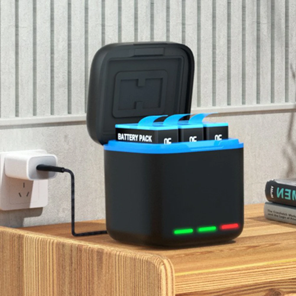 Baterías CCompatible con GoPro 12/11/10/9 simultáneamente, lo que le permite cargar las baterías de las cámaras Hero mediante intercambio en caliente, reduciendo así el tiempo de inactividad.