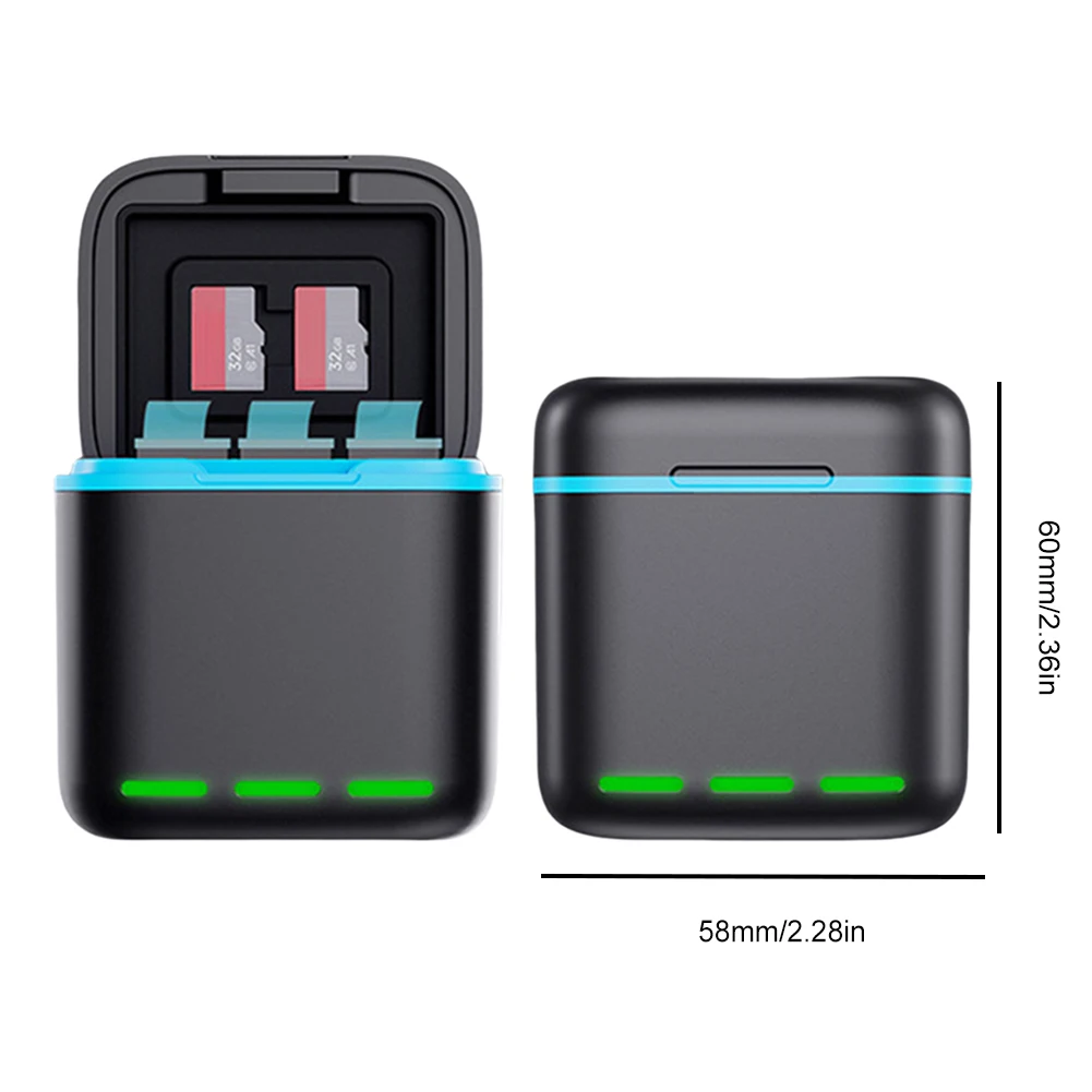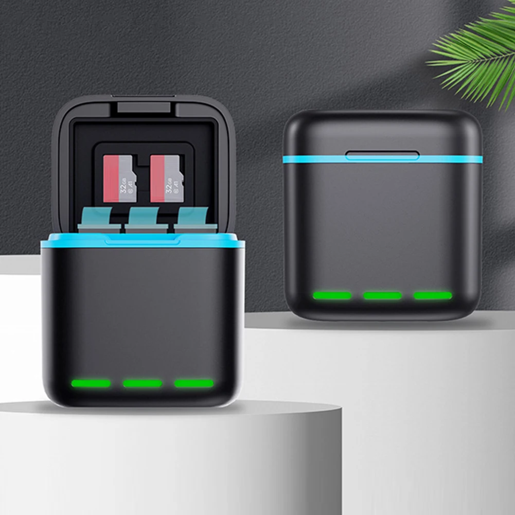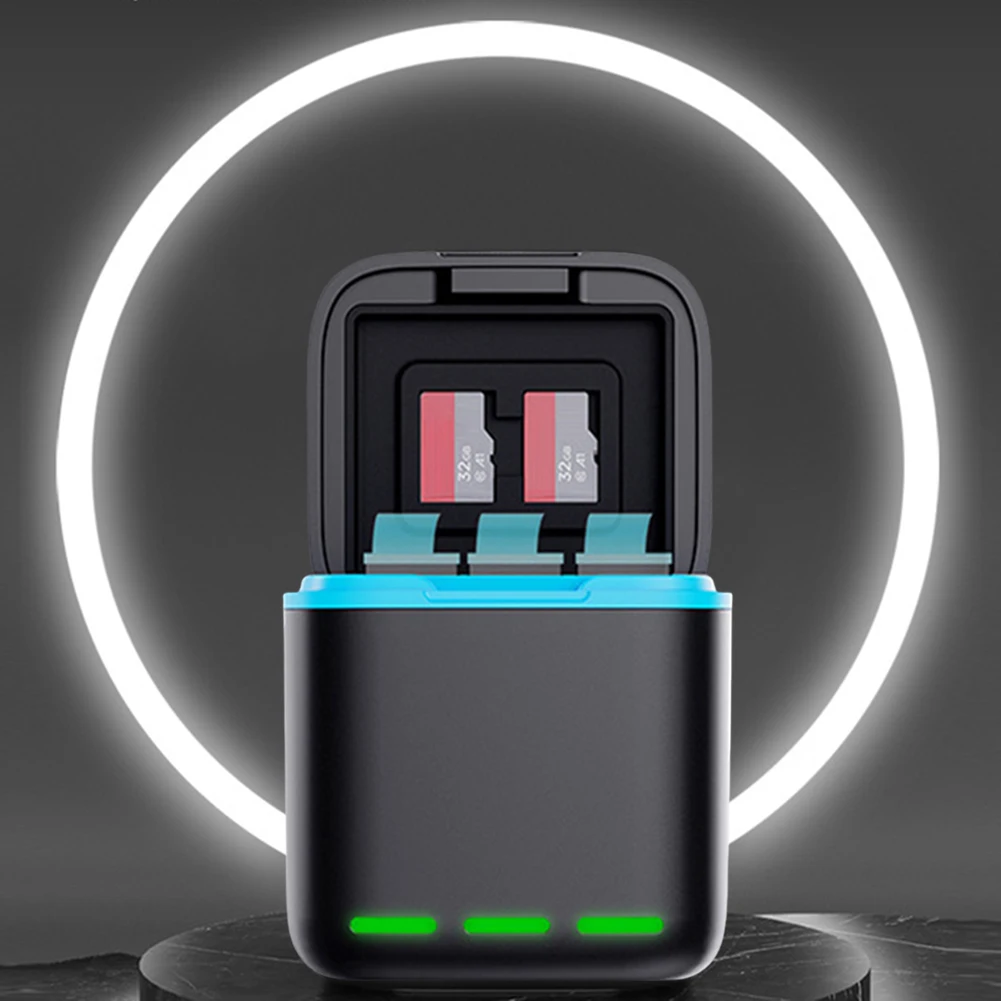 Cargador de batería de 3 canales Estación de carga de batería con cable tipo C Estuche de almacenamiento de baterías 2 Ranura SD Cargador de carga rápida