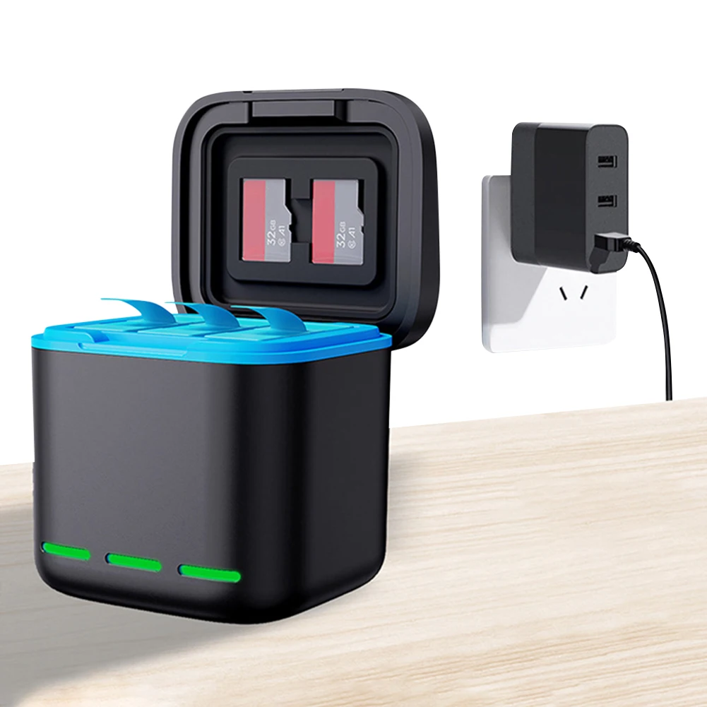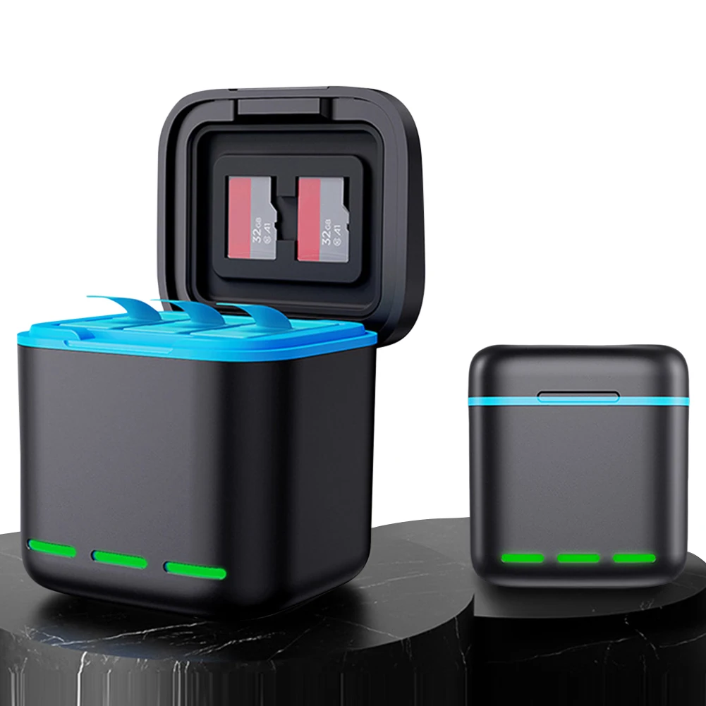 Cargador de batería de 3 canales Estación de carga de batería con cable tipo C Estuche de almacenamiento de baterías 2 Ranura SD Cargador de carga rápida