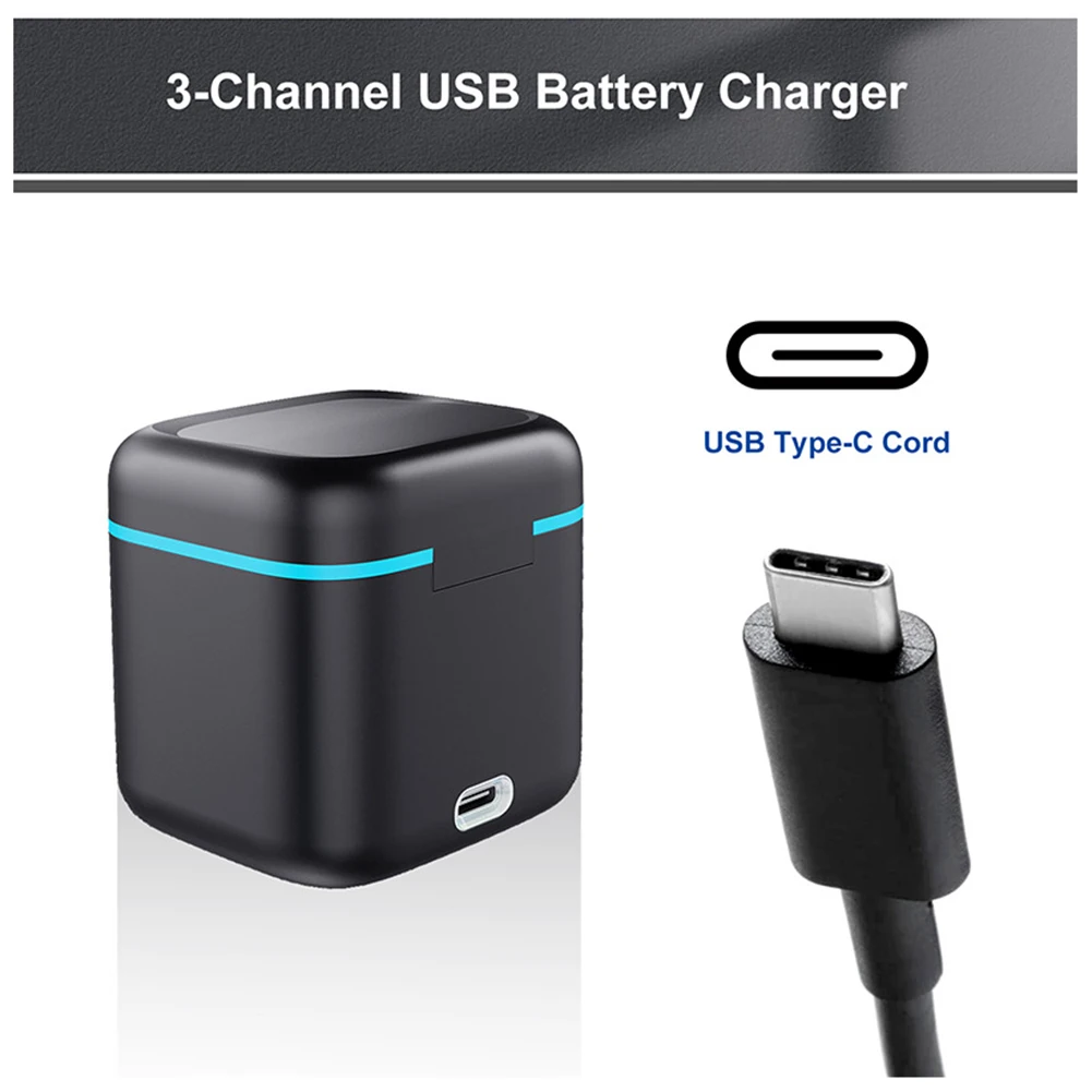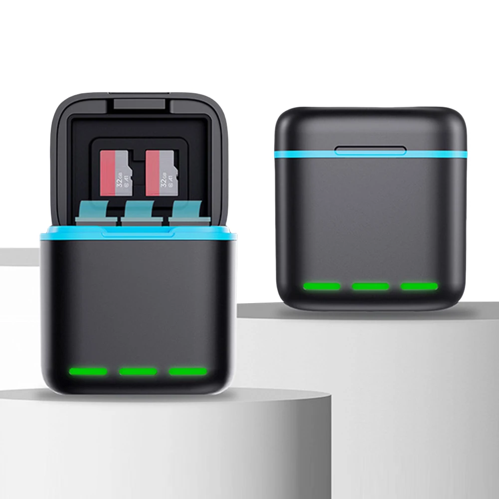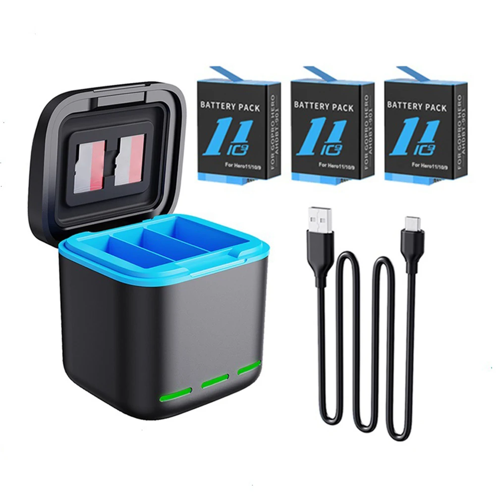 Cargador de batería de 3 canales Estación de carga de batería con cable tipo C Estuche de almacenamiento de baterías 2 Ranura SD Cargador de carga rápida Compatible conGo Pro Hero 12/11/10/9 Accesorios