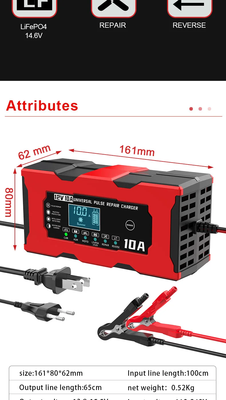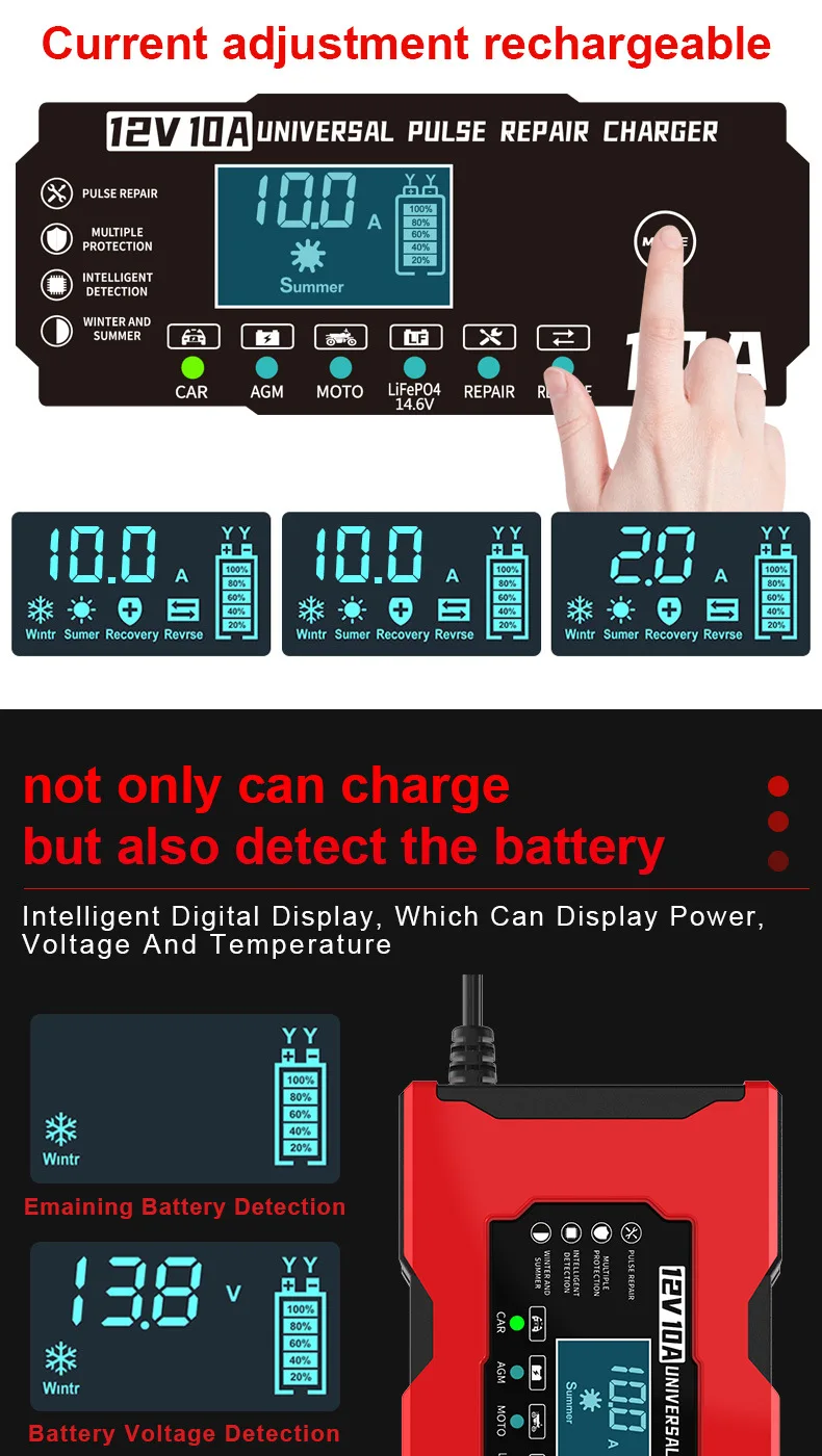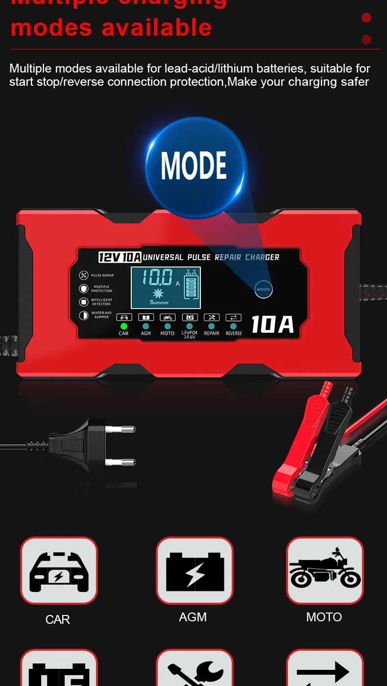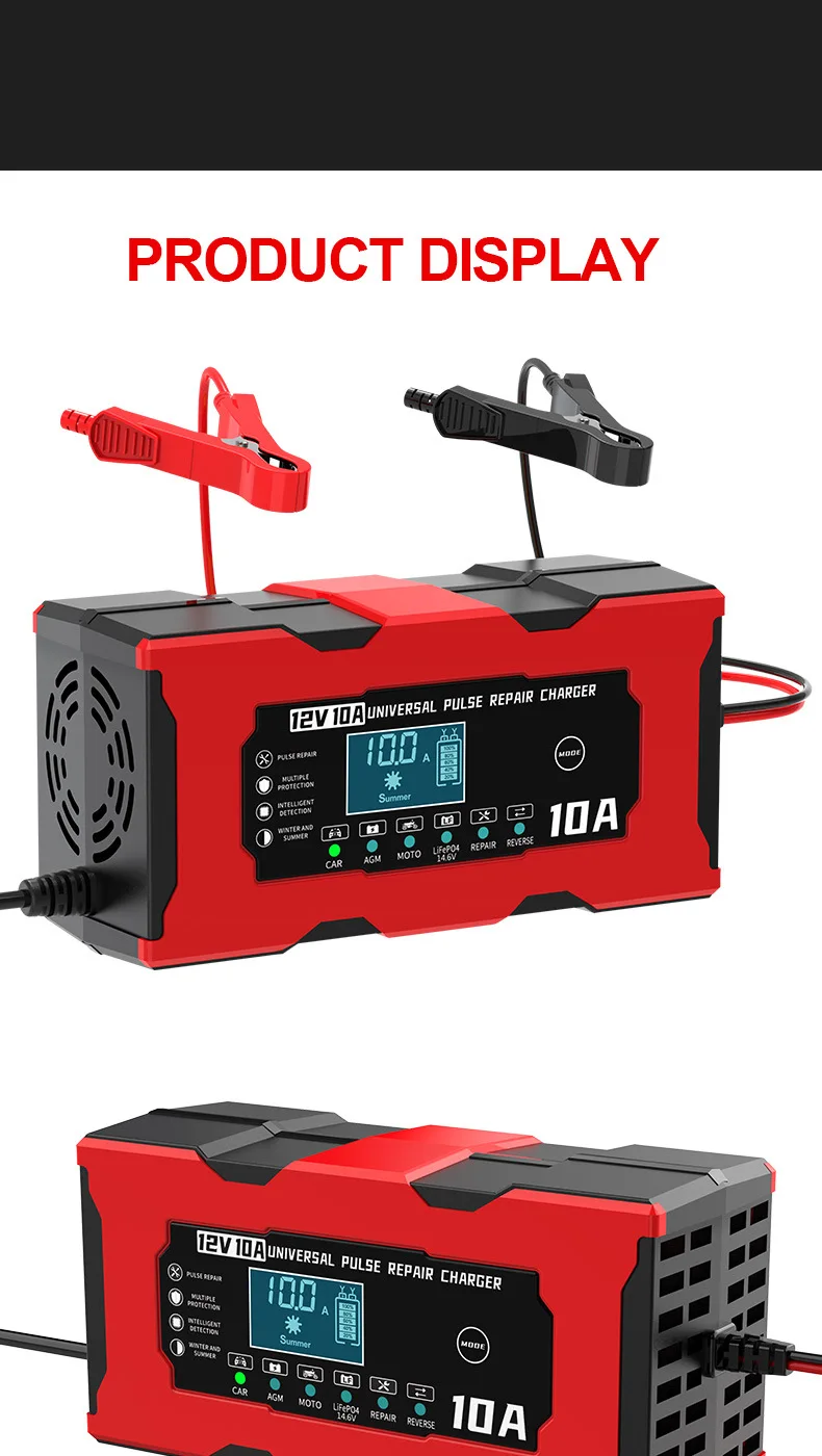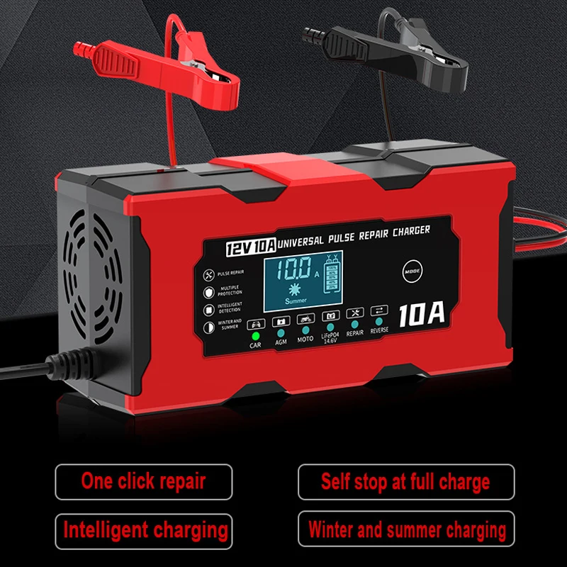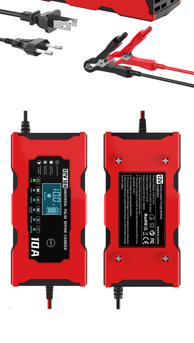 Cargador de batería de coche de 12V 10A, cargador de motocicletas eléctricas de 14,6 V 10A para Lifepo4, plomo ácido AGM GEL PB, reparación de baterías de litio inteligentes