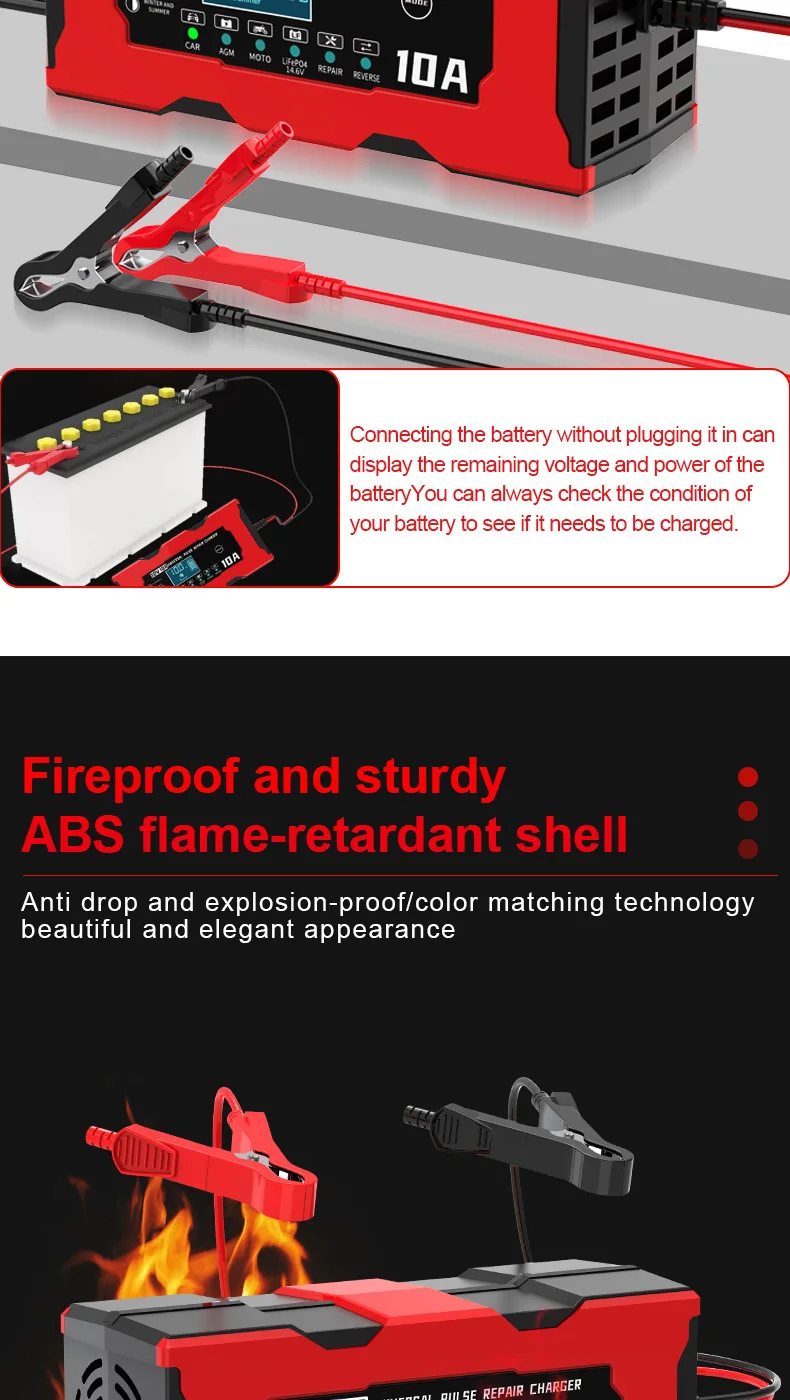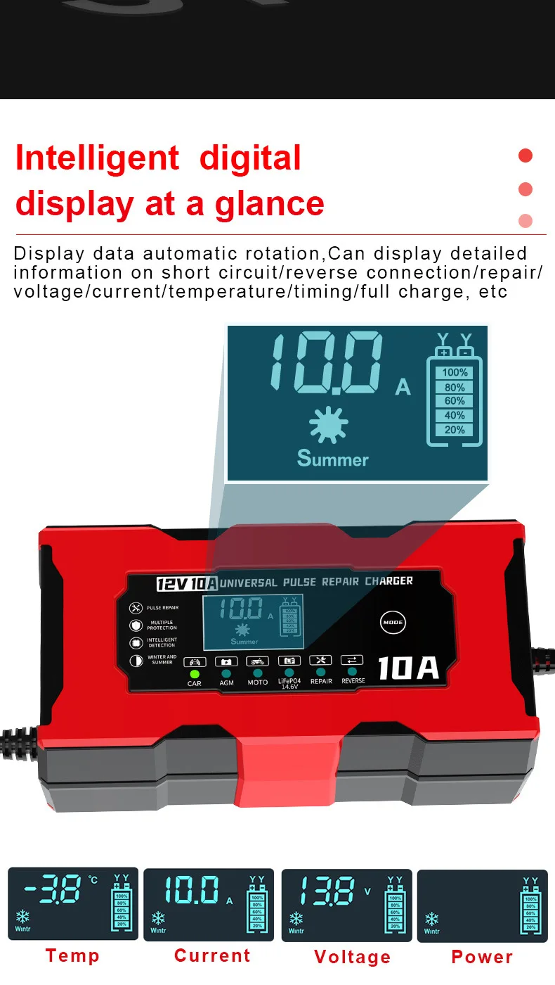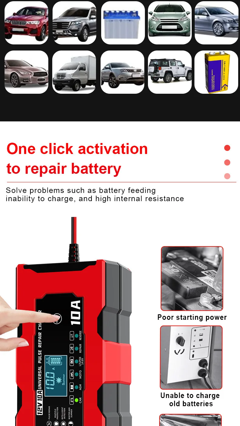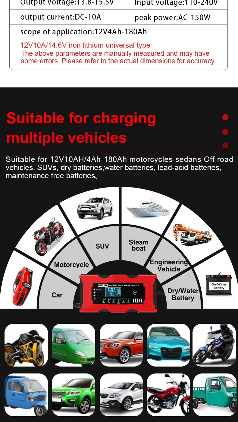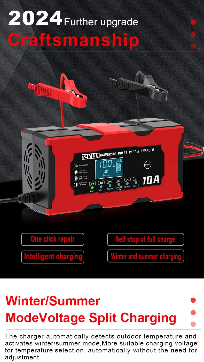 Cargador de batería de coche de 12V 10A, cargador de motocicletas eléctricas de 14,6 V 10A para Lifepo4, plomo ácido AGM GEL PB, reparación de baterías de litio inteligentes