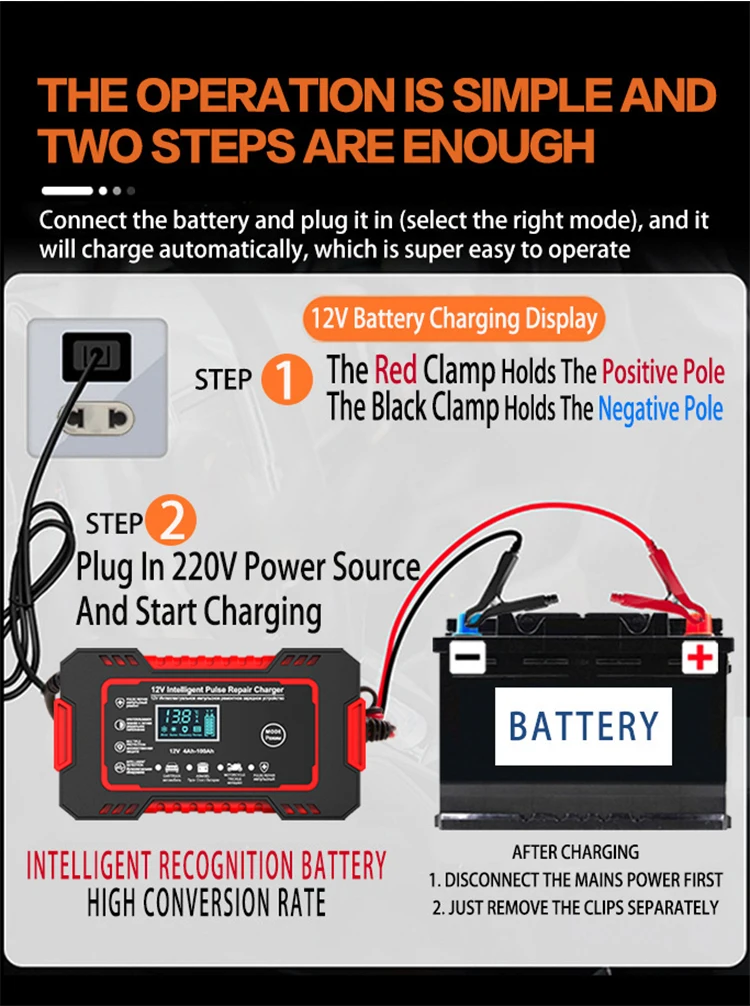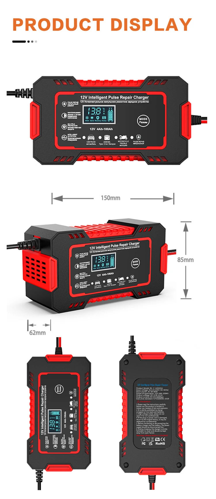 • Reparación del pulso de 12V 6A:El cargador proporciona una reparación de pulso de 12V 6A para cargar la batería de su automóvil de manera rápida y eficiente.