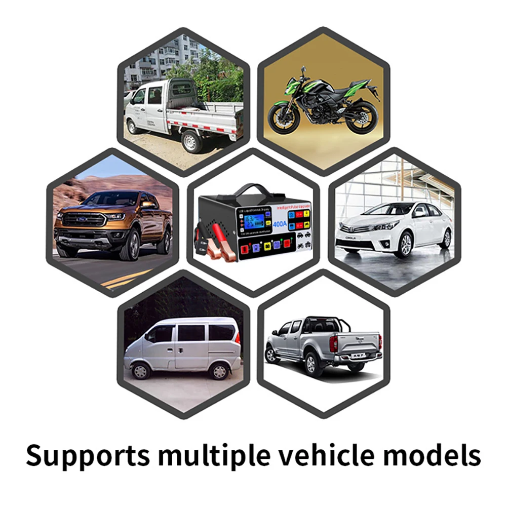 Cargador de batería de coche de 400A, batería de cinco etapas, cargador rápido de alta potencia, cargador de reparación de pulso inteligente, cargador de batería de parada automática