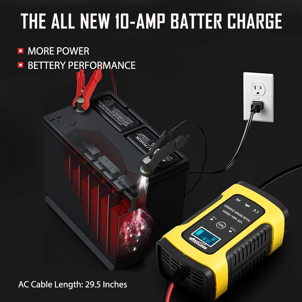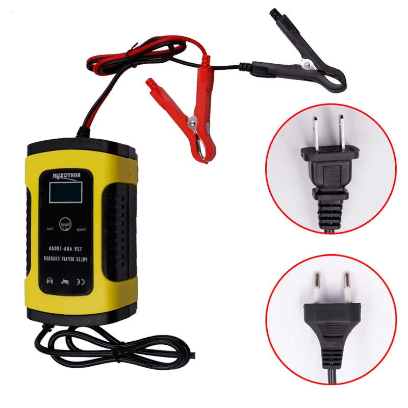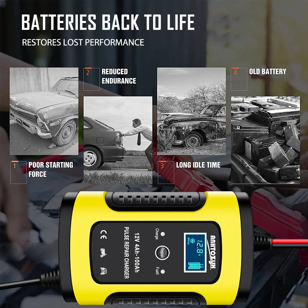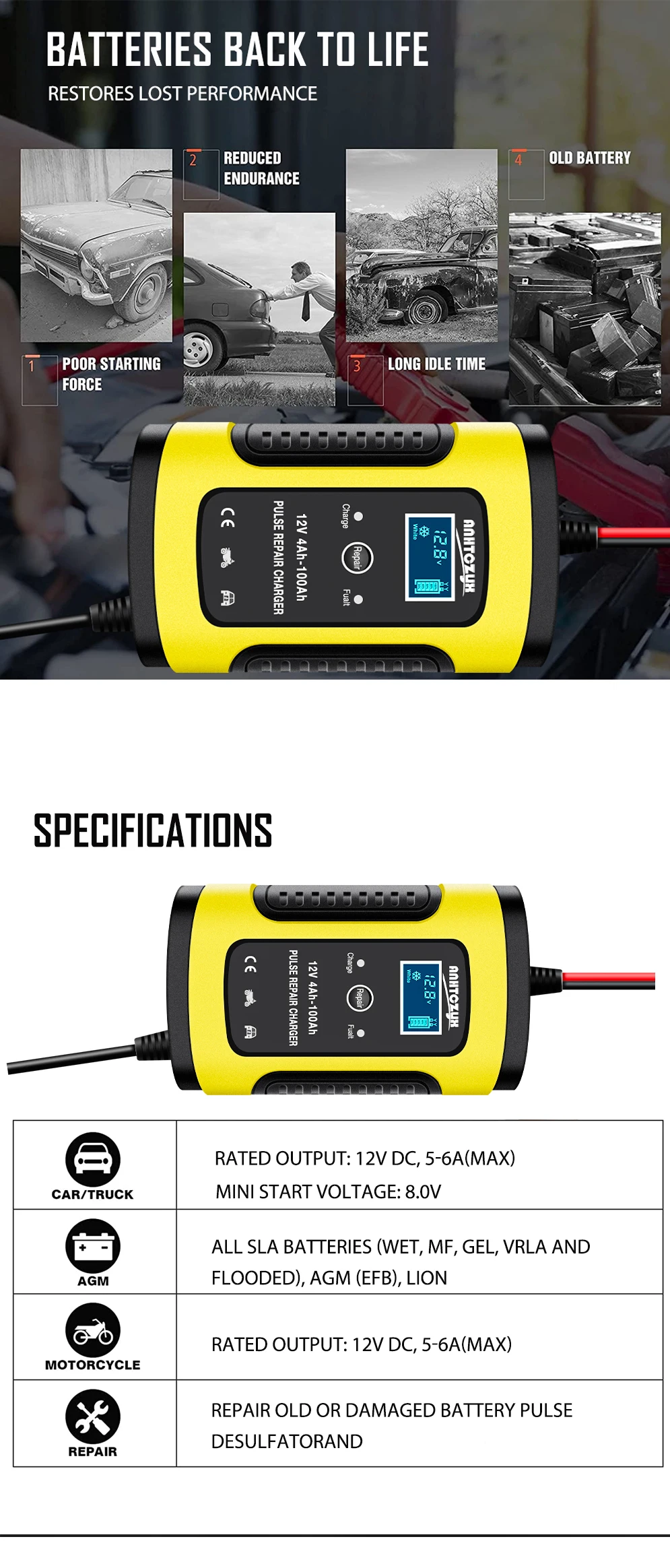 Cargador de batería para coche, cargadores de batería de ácido de plomo seco y húmedo, con pantalla LCD digital completamente automática, potencia de 12V y 6A, adecuado para reparación de pulsos de potencia de vehículo