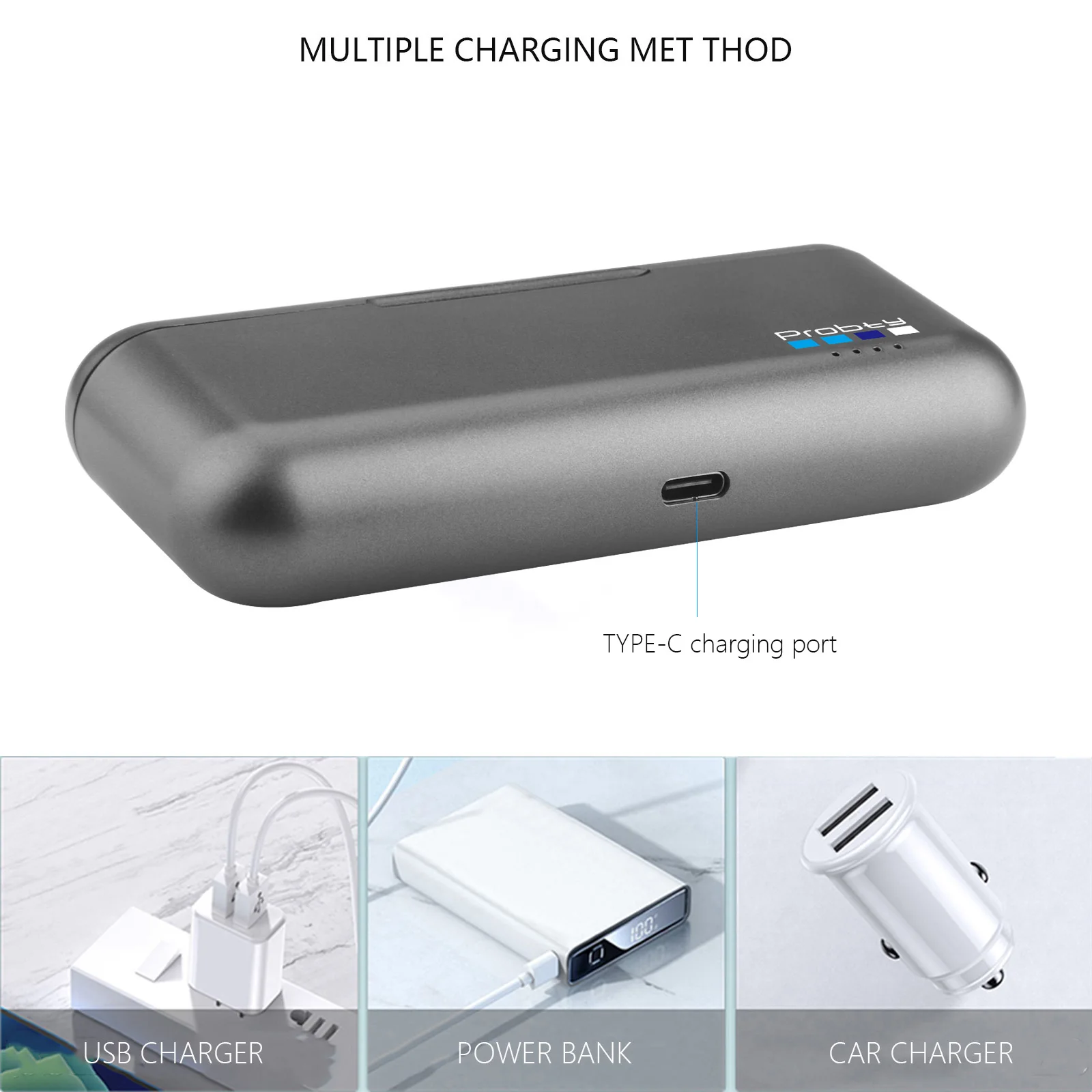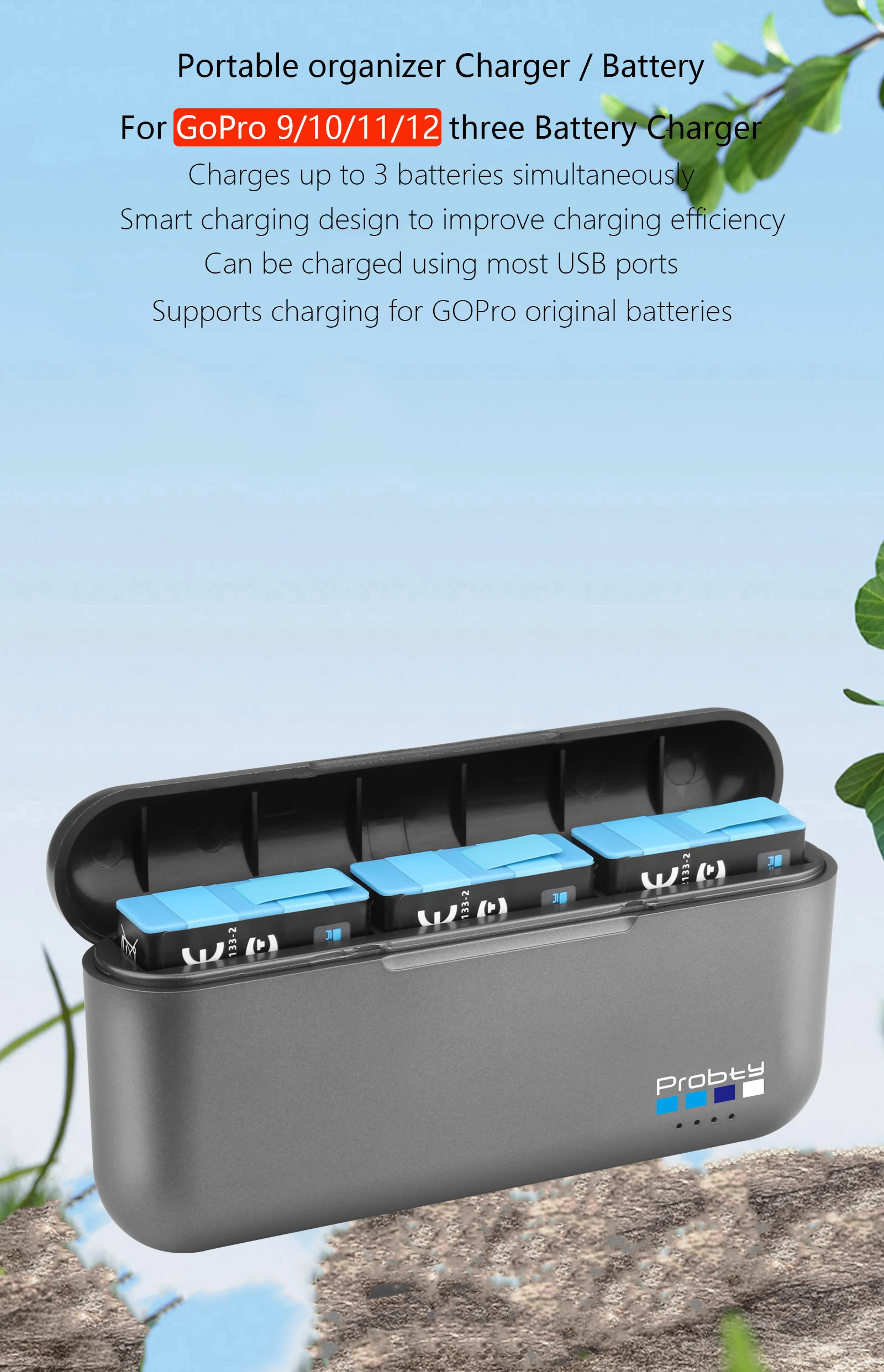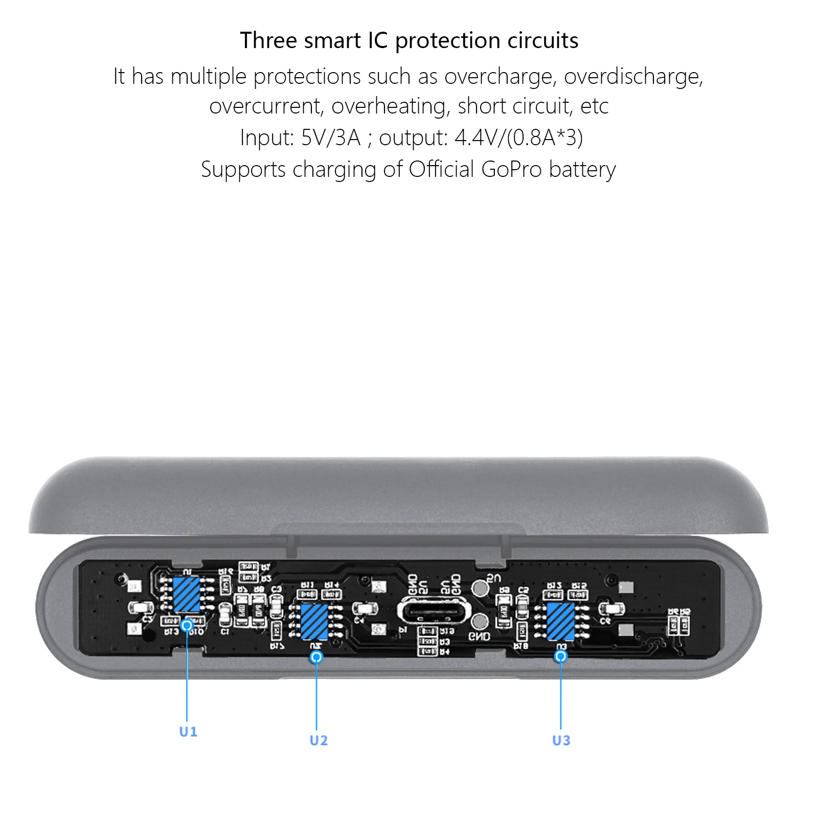Compatible con modelos:Para GoPro 12 GoPro 11 GoPro 10 GoPro 9Luz rojaEncendido normalCarga con luz rojaLuz verde completamente cargadaEspecificaciones del cargador:Parámetro de entrada: 5V / 3Aparámetro de salida: 4,4 V/0,8 A * 3)peso: 49 gDimensiones exteriores: 11,7*5,6*2,3 cmCaracterísticas del cargador:1.Cargador de batería 3 en 1 para cámara de acción GoPro.Puede cargar tres baterías simultáneamente,Compatible con la batería original.2.Carga rápida, alta corriente de 2,4 A, una carga completa solo tarda 3 h.3.El cargador se puede alimentar con un adaptador de cargador de pared, un banco de energía o su PC, computadora portátil, etc.4.El cargador está hecho de material de PC seleccionado de alta resistencia.El cargador y la batería de respaldo están completamente protegidos para evitar sobrecargas, cortocircuitos y descargas eléctricas.sobredescarga, sobrecalentamiento, sobrecorriente y sobretensión.5.Fácil de transportar: llévalo contigo dondequiera que vayas, puedes guardarlo en tu mochila o equipaje.y se puede utilizar como una excelente caja de almacenamiento para 3 baterías GoPro.7.Interfaz tipo c, no se requieren cables adaptadores.El cargador viene con un cable USB tipo C.Contenido del paquete:1 x caja de carga1 cable de carga.