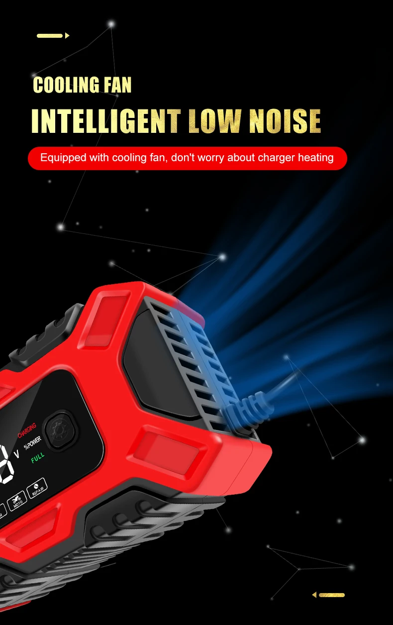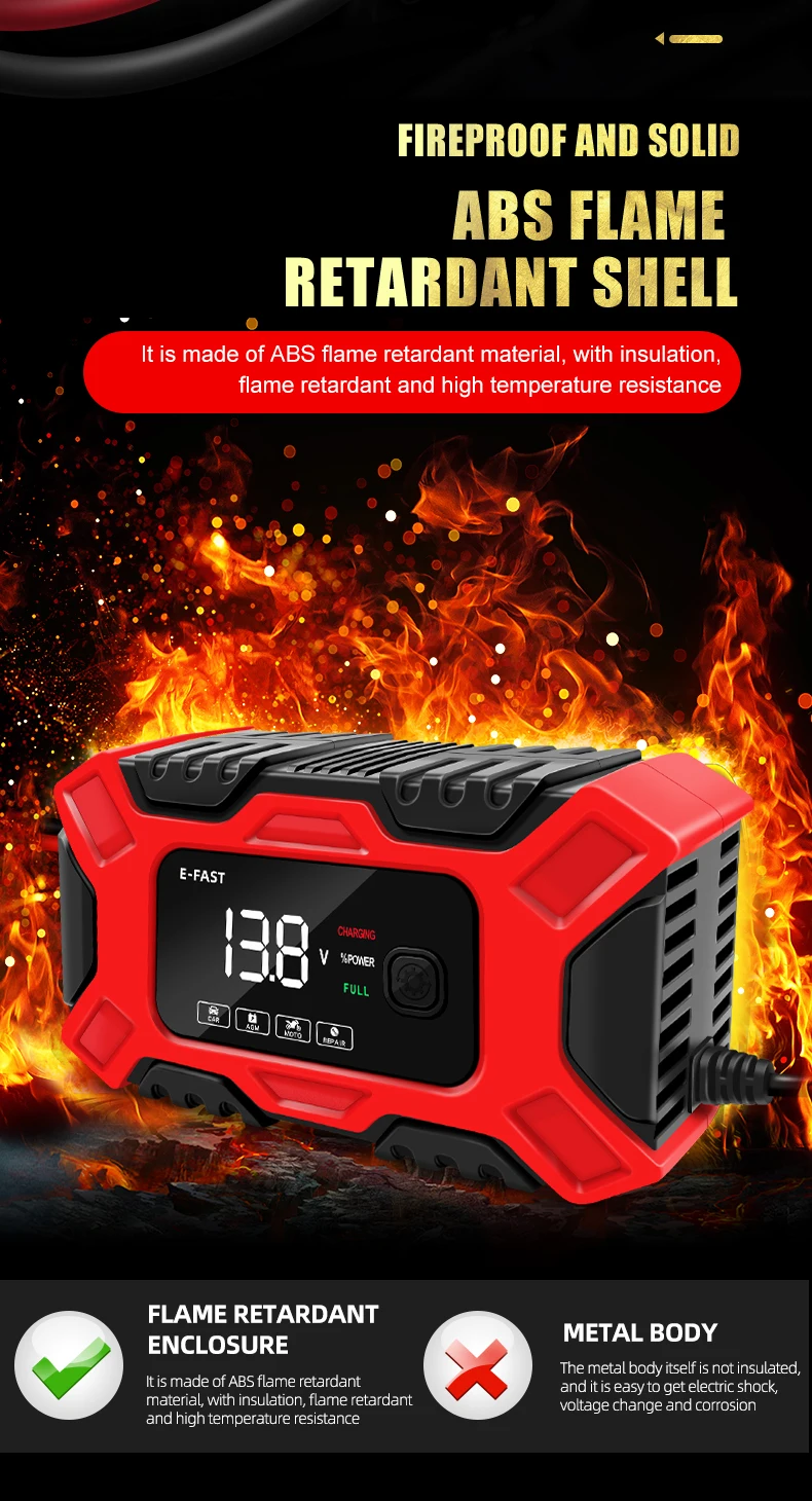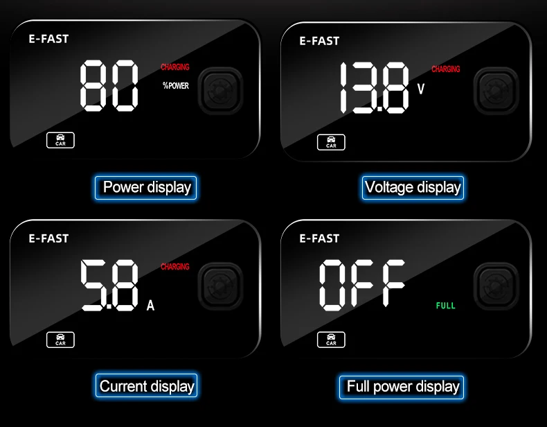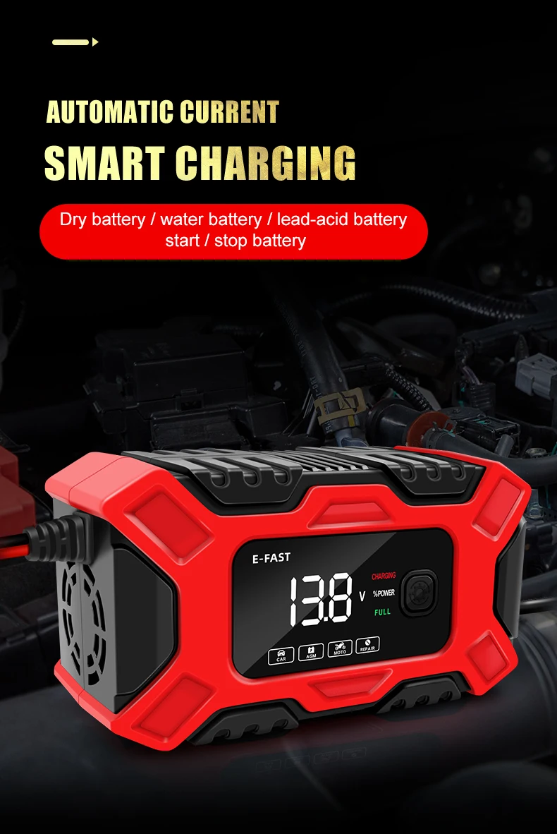 Cargador de batería inteligente E-FAST para coche y motocicleta, mantenimiento de carga de pulso de batería de plomo ácido, carga inteligente, pantalla LCD Digital