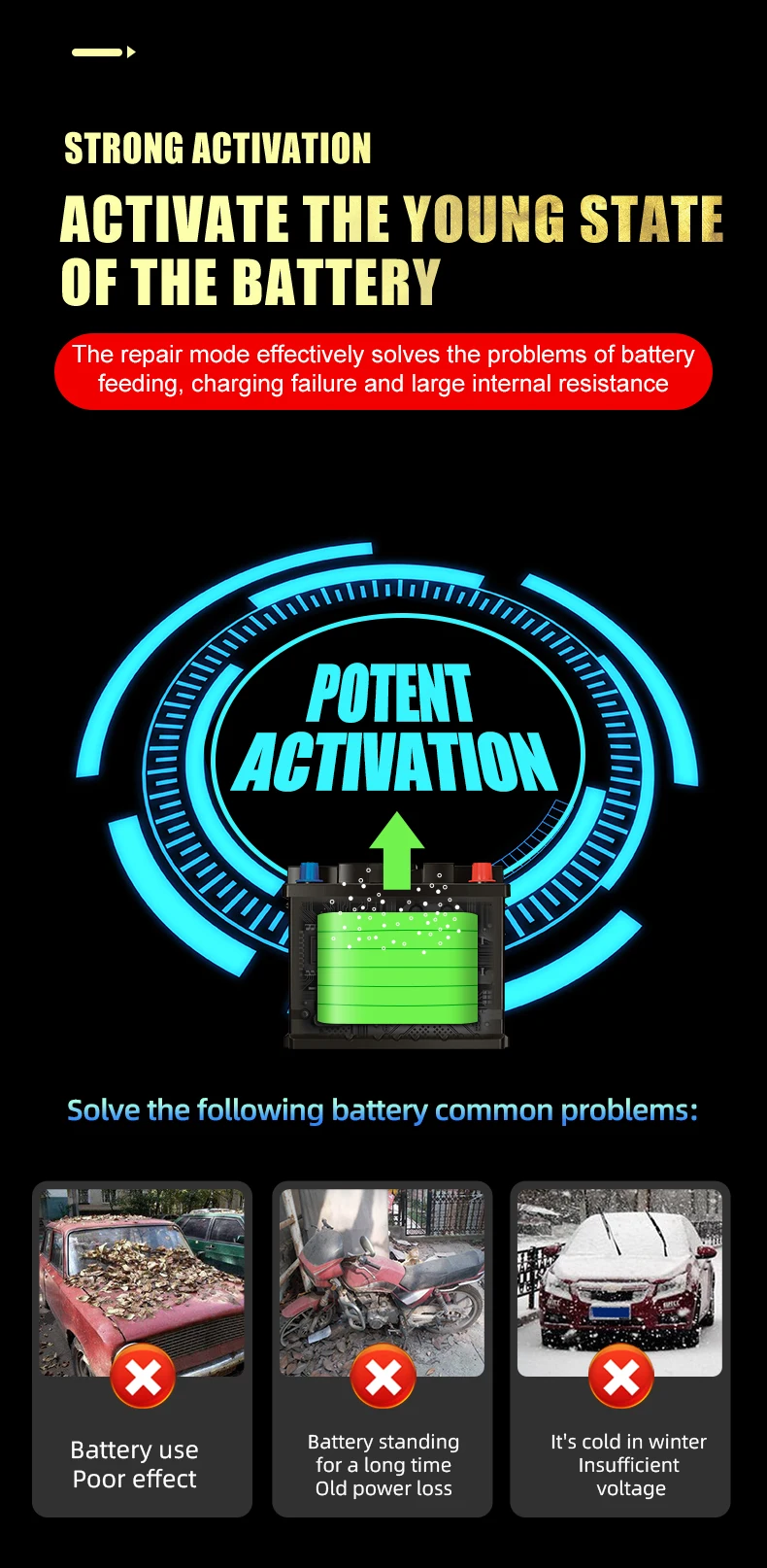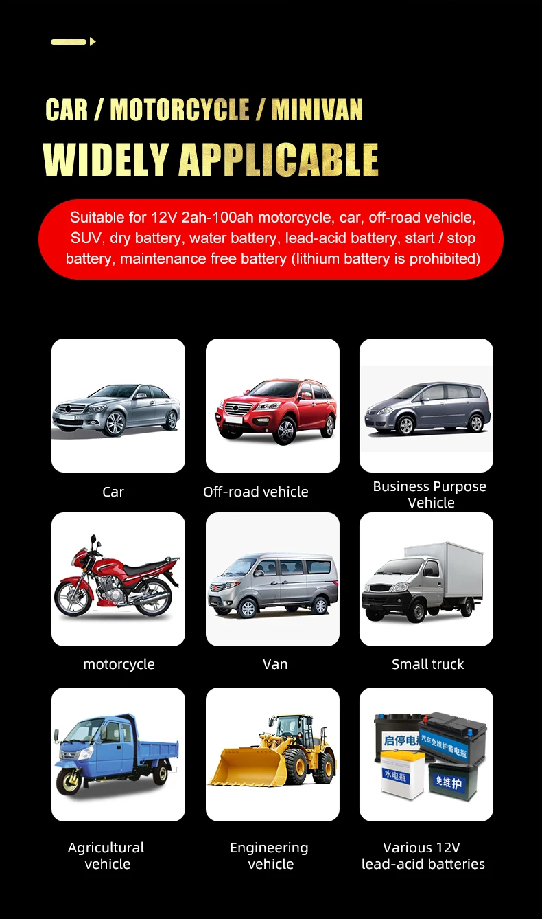 Tipos de baterías: La mayoría de los tipos de baterías de plomo-ácido, incluidas calcio, gel AGM, húmedas, plomo-ácido, etc.