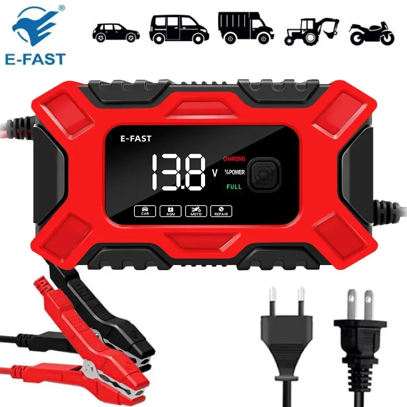 Cargador de batería inteligente E-FAST para coche y motocicleta, mantenimiento de carga de pulso de batería de plomo ácido, carga inteligente, pantalla LCD Digital