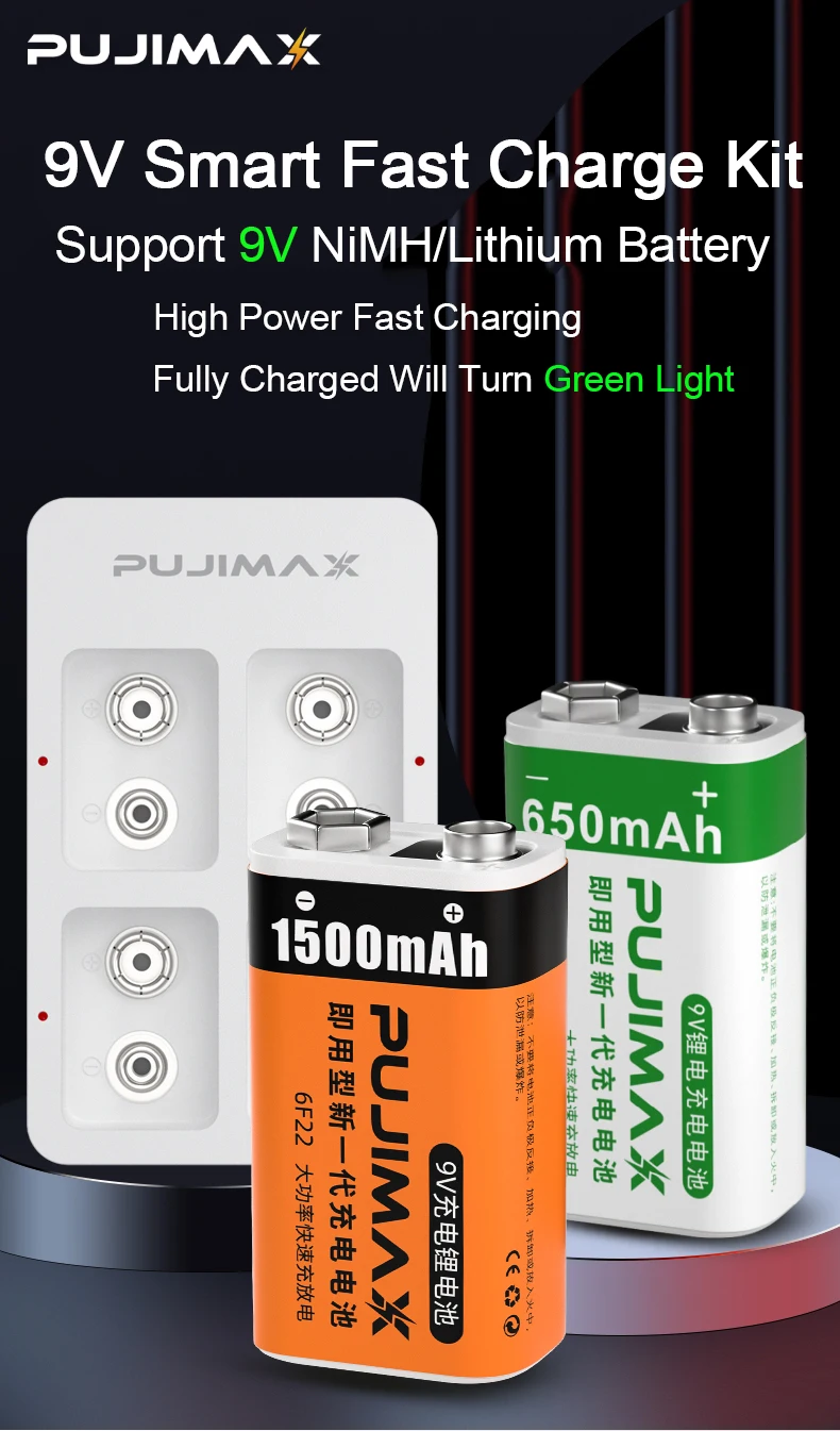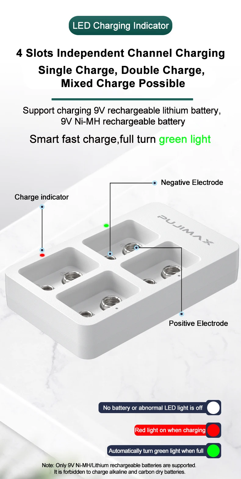 Describa:-- Nombre del producto: Cargador rápido inteligente de 4 ranuras de 9V-- Entrada: 5V/2A-- Salida: 9V 50mA(9V NI-MH/8,4 V 200mA/8,4 V Li-ion).-- Tamaño: 60*40*16mm-- Color: negro/blanco-- Peso: aproximadamente 46g-- Enchufe del cargador: Interfaz micro USB AndroidFunciones:1.100% nuevo y de alta calidad y barato y venta de fábrica2. Cargador de batería de alto rendimiento para 1-4 baterías recargables de Ni-MH/Ni-Cd/Li-ion de 9V.3. Fácil de usar/con cable de carga4. Tamaño pequeño y fácil de llevar5. Luz roja al cargar, se vuelve verde cuando está completamente cargada.Aviso:1. No cargue baterías alcalinas o secas de carbono2. No lo use bajo altas temperaturas o humedad.3. Solo se aplica a baterías recargables de 9V Ni-MH/Ni-Cd/Li-ion.Paquete incluido:1 cargador de batería de 9V1 * Cable micro USB