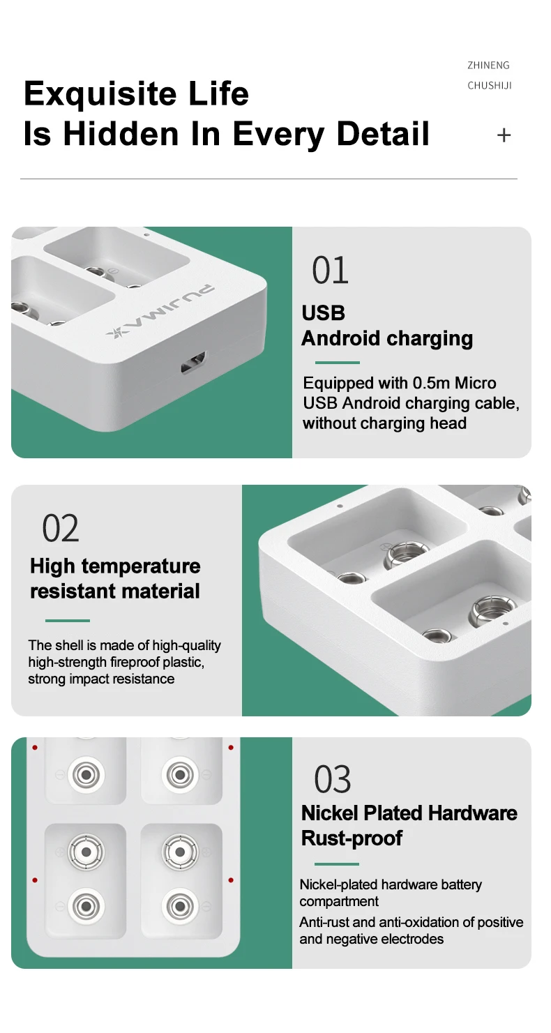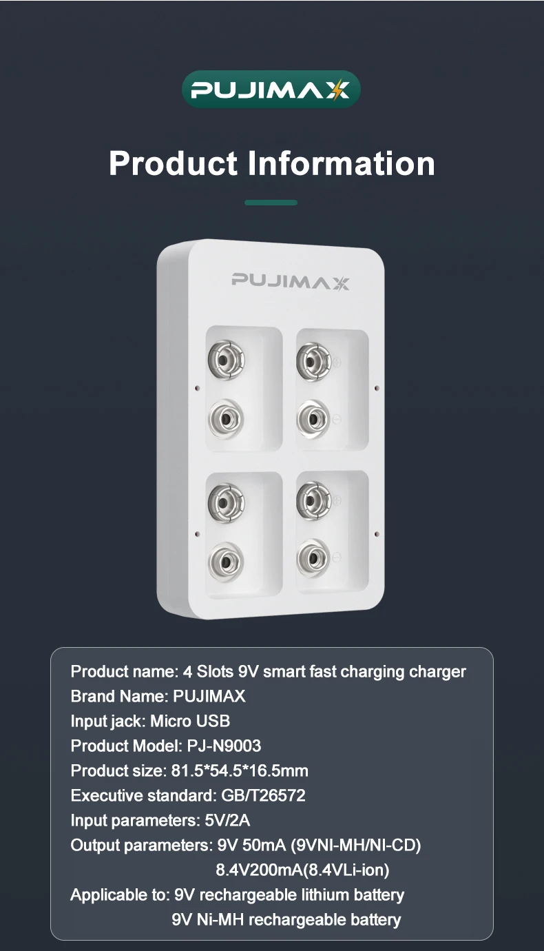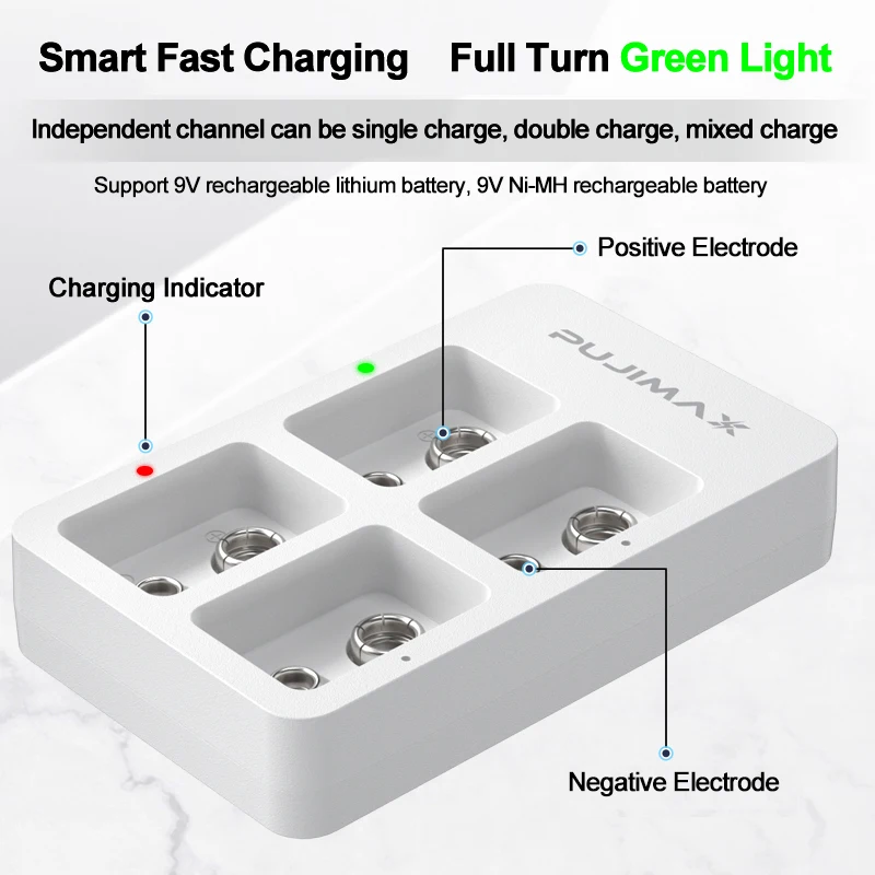 Describa:-- Nombre del producto: Cargador rápido inteligente de 4 ranuras de 9V-- Entrada: 5V/2A-- Salida: 9V 50mA(9V NI-MH/8,4 V 200mA/8,4 V Li-ion).-- Tamaño: 60*40*16mm-- Color: negro/blanco-- Peso: aproximadamente 46g-- Enchufe del cargador: Interfaz micro USB AndroidFunciones:1.100% nuevo y de alta calidad y barato y venta de fábrica2. Cargador de batería de alto rendimiento para 1-4 baterías recargables de Ni-MH/Ni-Cd/Li-ion de 9V.3. Fácil de usar/con cable de carga4. Tamaño pequeño y fácil de llevar5. Luz roja al cargar, se vuelve verde cuando está completamente cargada.Aviso:1. No cargue baterías alcalinas o secas de carbono2. No lo use bajo altas temperaturas o humedad.3. Solo se aplica a baterías recargables de 9V Ni-MH/Ni-Cd/Li-ion.Paquete incluido:1 cargador de batería de 9V1 * Cable micro USB