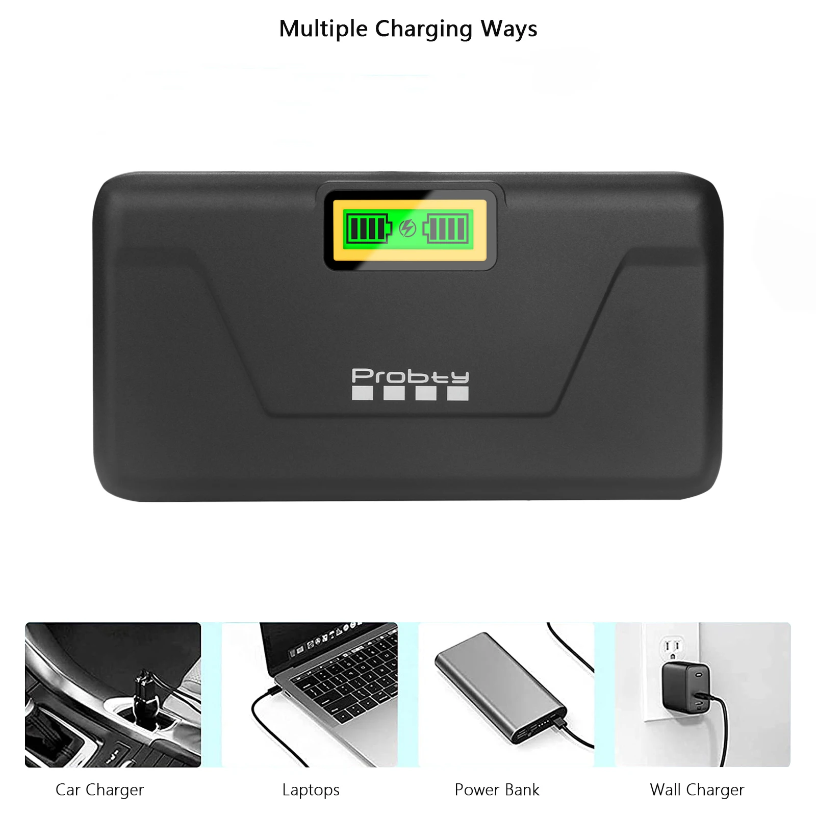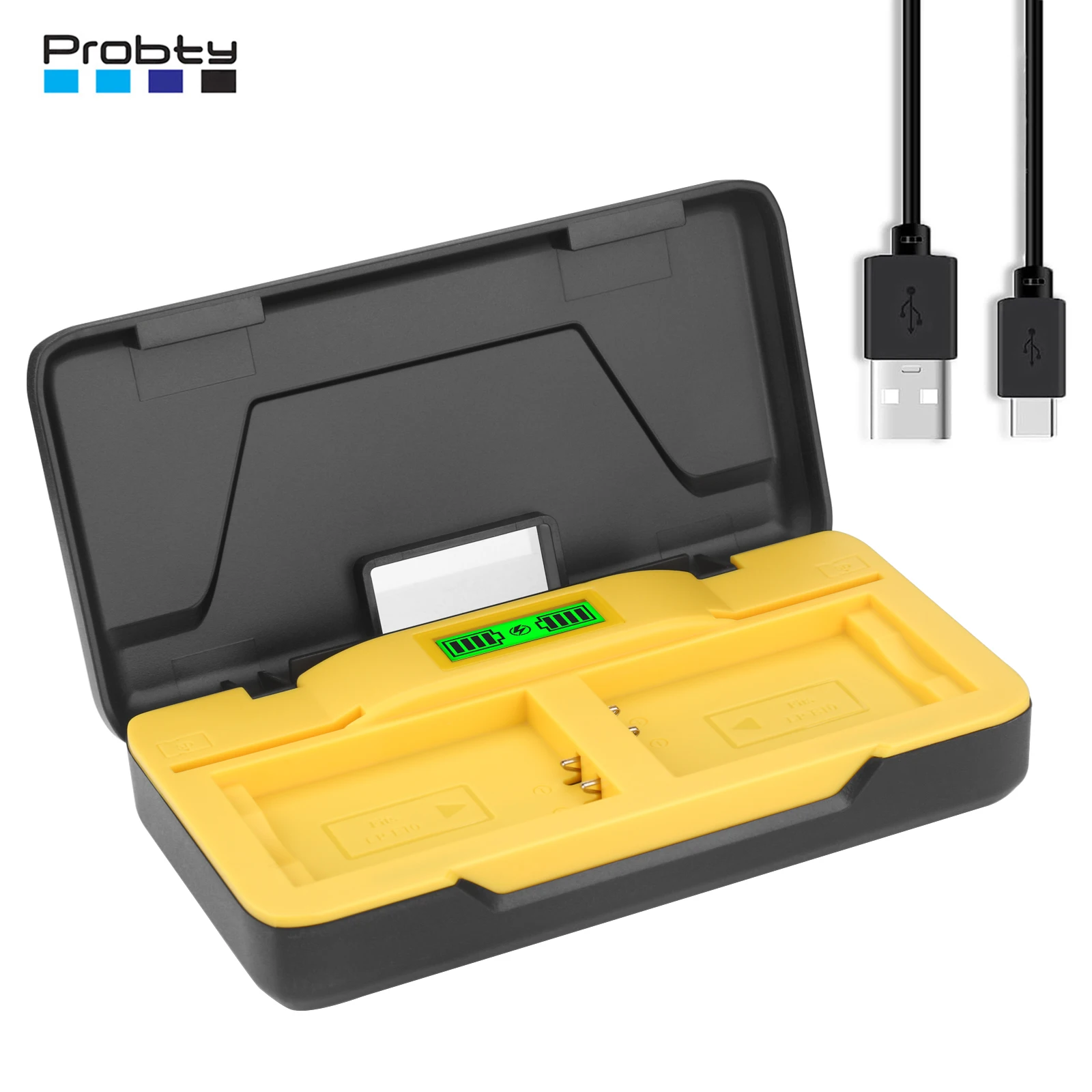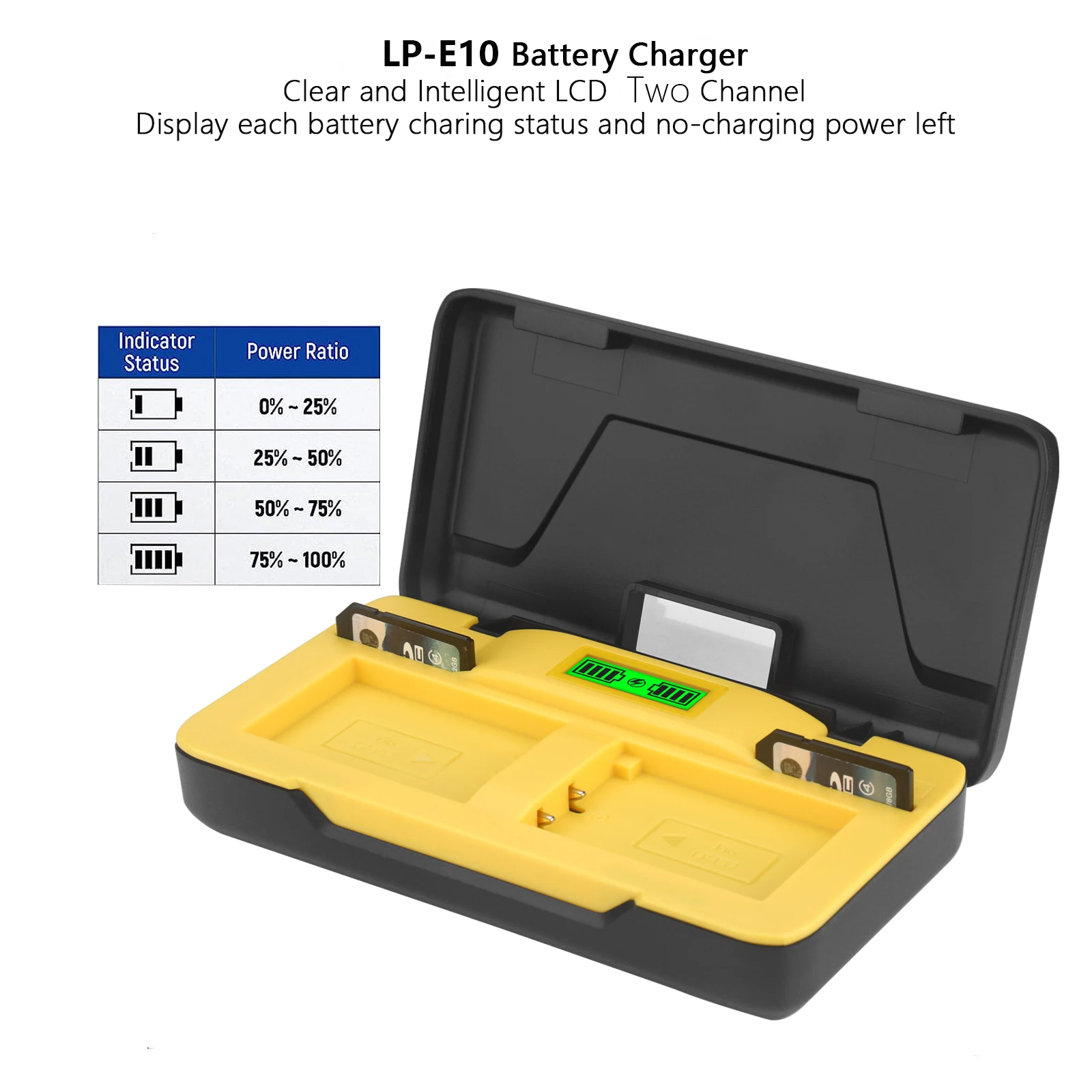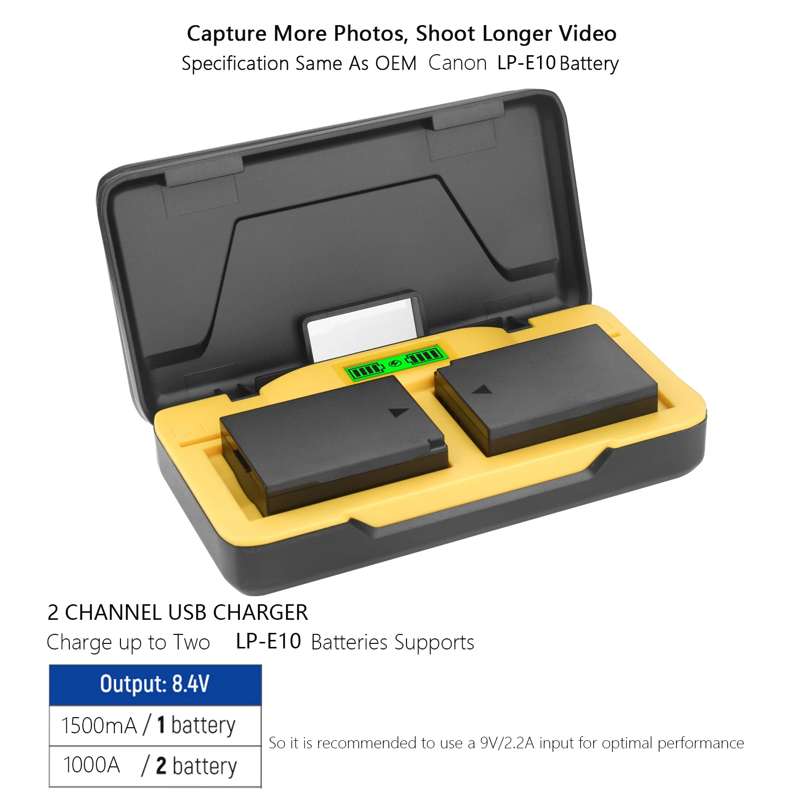 Características Cargador:1. Carga rápida y cómoda: Entrada USB-C PD20W: 9V/2A-2,22A Salida: 8,4V/1,5A*1 1A*2.2. Seguro y confiable: el cargador LP-E10 está diseñado con seis protecciones para evitar sobretensión,Sobrecarga, sobredescarga, sobrecorriente, sobrecalentamiento y cortocircuito.3. Función de almacenamiento: el cargador de batería no solo ofrece la funcionalidad de cargar la batería de su cámara,pero también podría usarse como estuche de almacenamiento para almacenar dos paquetes de baterías.Además,incorpora dos ranuras para tarjetas SD para acomodar sus tarjetas SD.Especificaciones del cargador:Entrada: 9V/2A-2,22ASalida: 8,4 V/1,5 A * 1 A * 2Entrada: 5V/2ASalida: 8,4 V/1 A*1 600 mA*2Modelos de cámaras compatibles:Para cámaras digitales Canon Rebel T3 T5 T6 T7 Kiss X50 Kiss X70 1100D 1200D1300D 2000D 1500DNota:Probty Replacement LP-E10 no es apto para cámaras CANON Rebel T3i, T5i, T6iEl paquete incluye:Cargador de batería para cámara LP-E10 de 2 canales*1Cable de carga C a C de 20W*1Manual de usuario*1