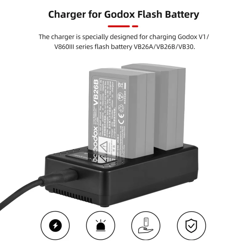 【Cargador para batería Godox Flash】 El cargador está especialmente diseñado para cargar la batería de flash de la serie Godox V1/ V860III VB26A/VB26B/VB30.