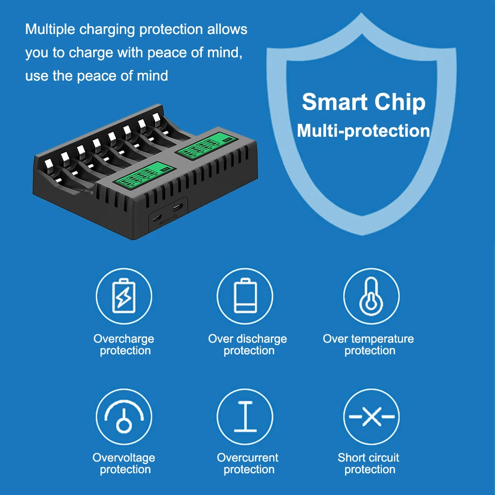 Compatibilidad: Este cargador de batería es adecuado para baterías recargables AA y AAA, asegúrese del tipo de batería antes de realizar el pedido, evitando problemas.8 ranuras: Este equipo de carga de batería está diseñado con 8 ranuras de carga, conveniente para cargar 8 piezas de baterías a la vez, ahorrando tiempo y fuerza de manera efectiva.Pantalla LCD: el diseño de la pantalla digital le facilita conocer el estado de carga, lo que hace que la carga sea más cómoda.Protección: este dispositivo de carga de batería funciona con protección de polaridad inversa, que protege su batería de la sobrecarga, Prolongando el tiempo de servicio de la batería.Portátil: este cargador de batería es fácil de almacenar y transportar porque es pequeño y liviano, no ocupará mucho espacio en su mochila, adecuado para viajes, hogar, oficina, hotel, etc.Especificación:Material: plástico.Color: negro.Tamaño: aprox. 122*92*33mm/4,8x3,62x1,3 pulgadas.Ranura: 8 ranuras.Corriente de carga: 1800mA.Entrada: DC 5V 2A.Batería adecuada: pilas recargables AA/AAA.Salida: 1,2 V 2000mA AA125mAx1, AA1000mAA5 Ax2, AA660mAx3, AA500mAx4, AA400mAx5, AA330mAx6, AA285mAx7, AA250mAx8; AAA1000mAx1, AAA500mAx2, AAA330mAx4 Ax3, A140A2504Nota:No utilice el cargador al aire libre o en ambientes húmedos.Si el cargador no funciona, la razón puede ser que la batería esté completamente cargada, envejecida, cortocircuitada, instalada al revés, batería normal o el poste eléctrico esté sucio.Debido a la diferencia de luz y pantalla, el color del artículo puede ser ligeramente diferente al de las imágenes.Permita una ligera desviación en los datos de medición y asegúrese de que no le importa antes de realizar el pedido.El paquete incluye:Cargador de batería de 1 pieza.