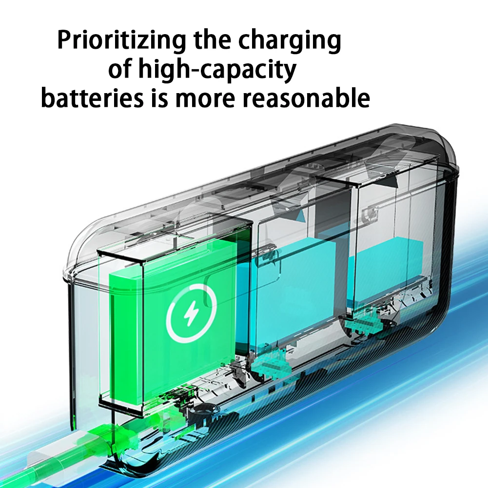 3. Modos de Carga inteligente:El estuche de carga USB de triple ranura cambia inteligentemente los modos de carga según el estado de carga de la batería, proporcionando un cuidado óptimo para sus baterías. Esta funcionalidad inteligente ayuda a prolongar la duración de la batería y mantener su salud.