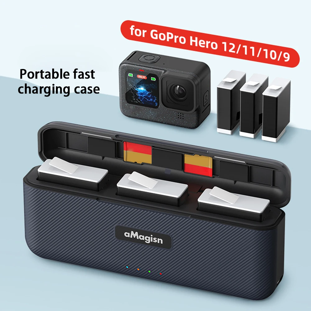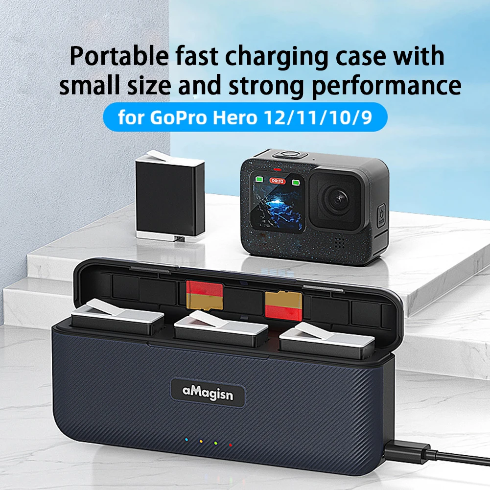 Comprar Cargador de batería USB-C para cámara de acción, caja de carga rápida de 3 canales de almacenamiento para GoPro Hero 12, 11, 10, 9