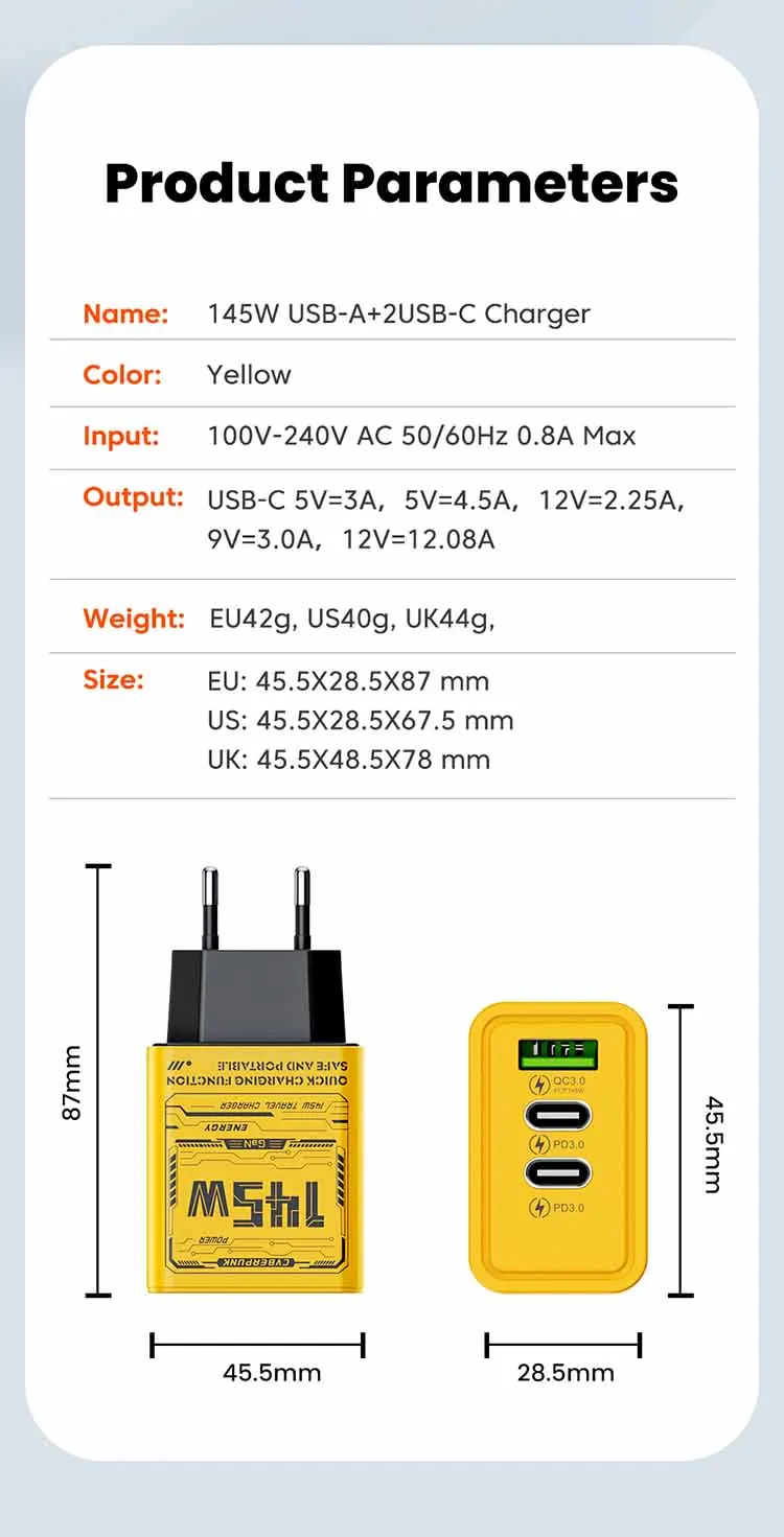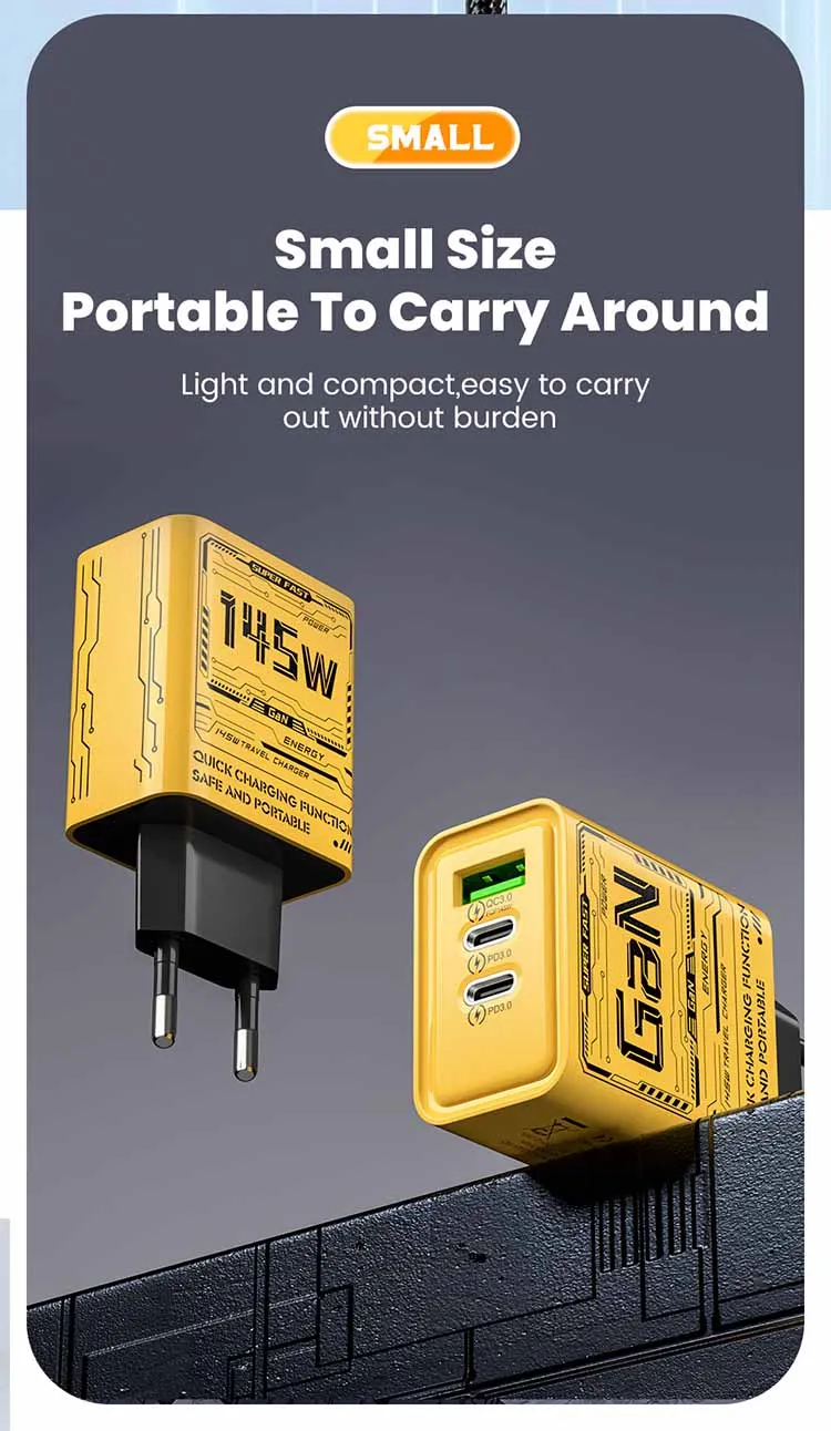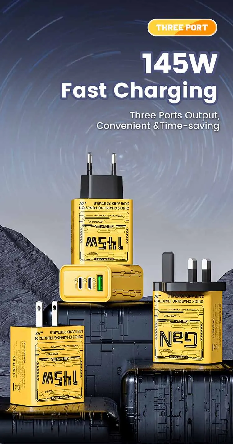 Cargador de carga rápida USB C de 145W para iPhone 15 Pro, adaptador de cargador multipuerto 3USB 3 tipo C para Samsung Xiaomi QC3.0
