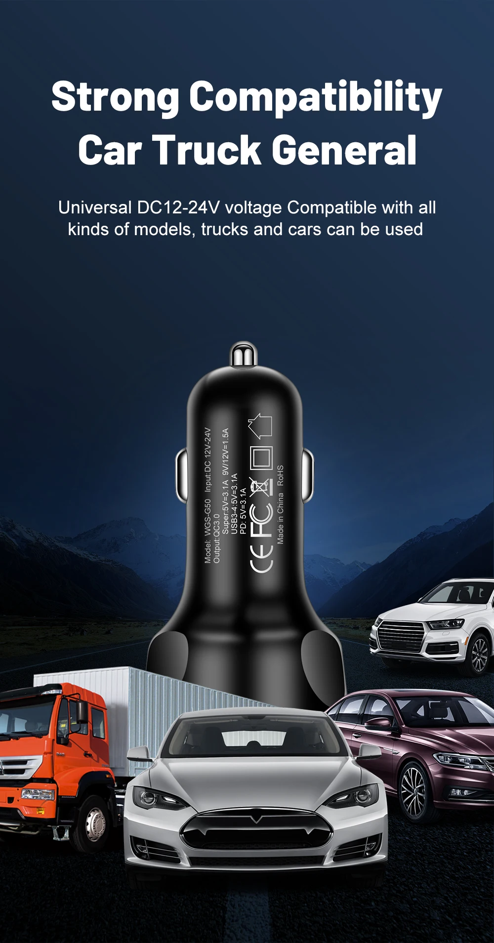 • Salida de alta potencia:Con una potencia de salida máxima de 27 W, este cargador para automóvil puede manejar incluso los dispositivos que consumen más energía, como tabletas y computadoras portátiles.