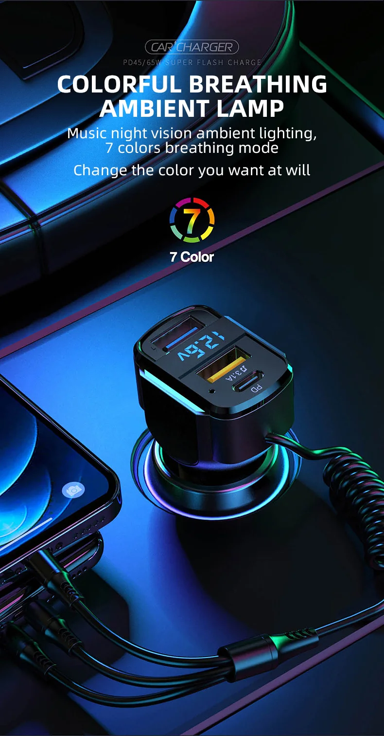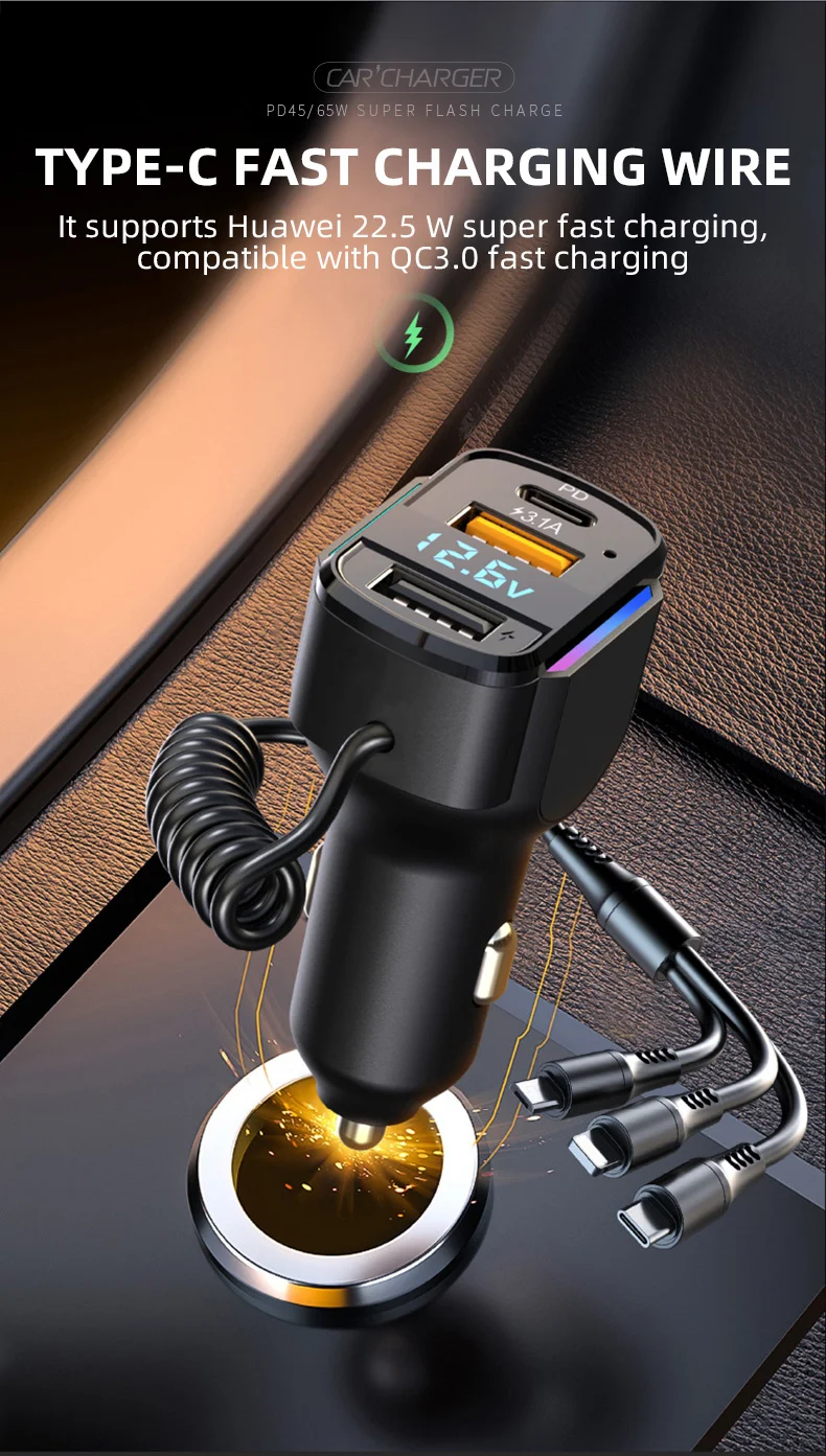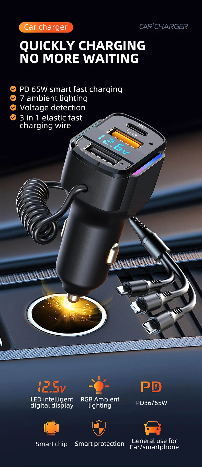 Comprar Cargador de coche 3 en 1 PD65W USB 1,2 m Cable de resorte de carga rápida para Samsung S23 S22 Xiaomi iPhone 15 14 13 Pro max