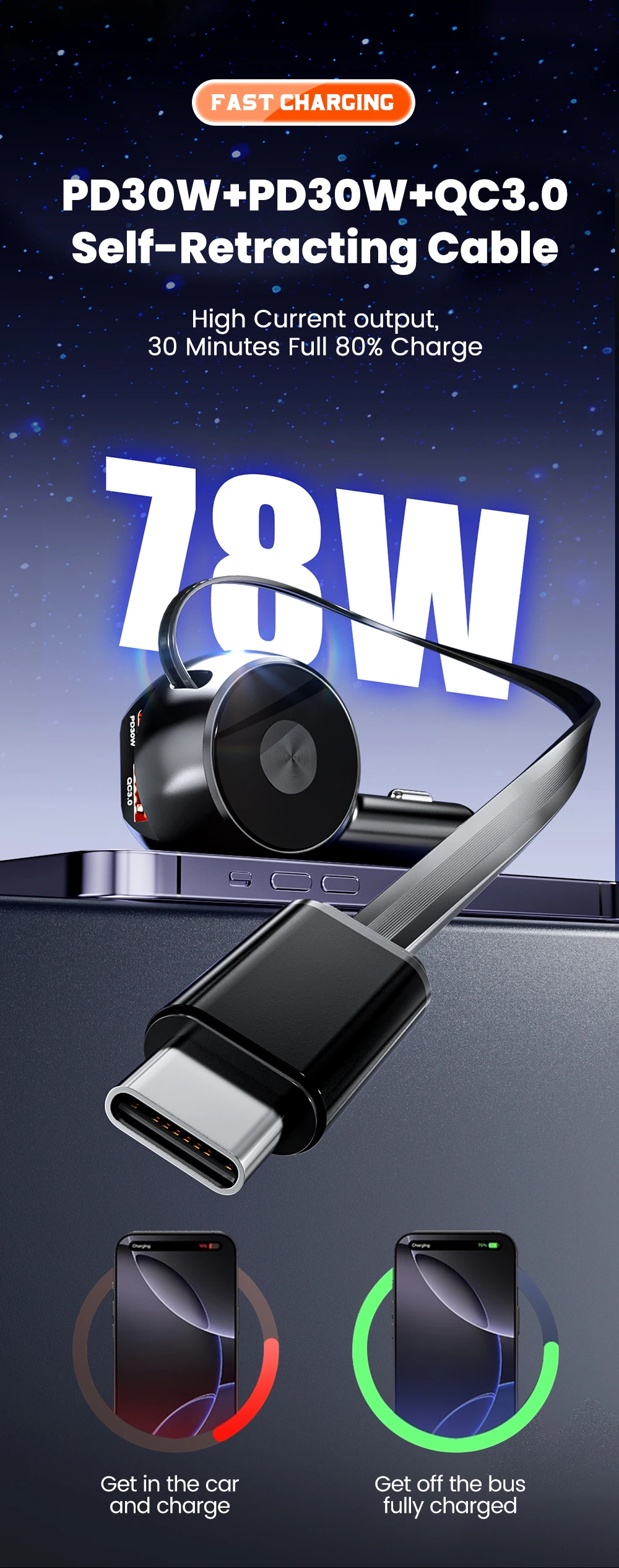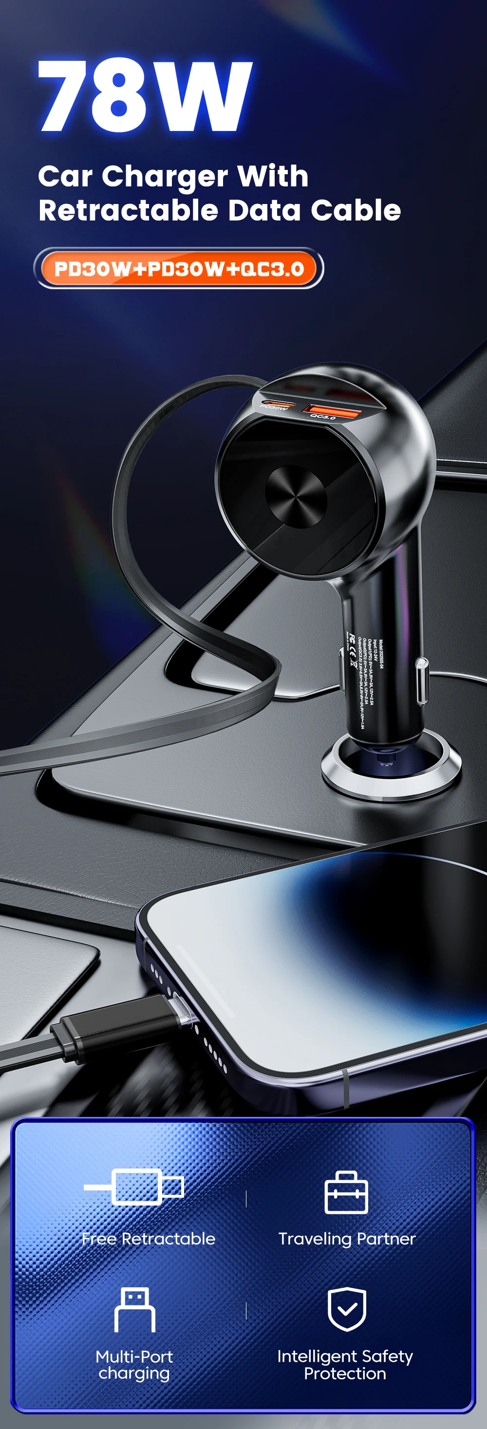 Cargador de coche de 3 puertos 78W con Cable de datos retráctil PD30W QC3.0 adaptador de cargador de teléfono de coche para iphone Samsung Huawei Xiaomi