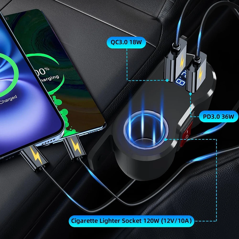 Cargador de coche 36W PD3.0 + 18W QC3.0 con interruptor de alimentación, salida USB de 12V, enchufe de encendedor de cigarrillos para coche, RV, motocicleta marina, camión, ATV