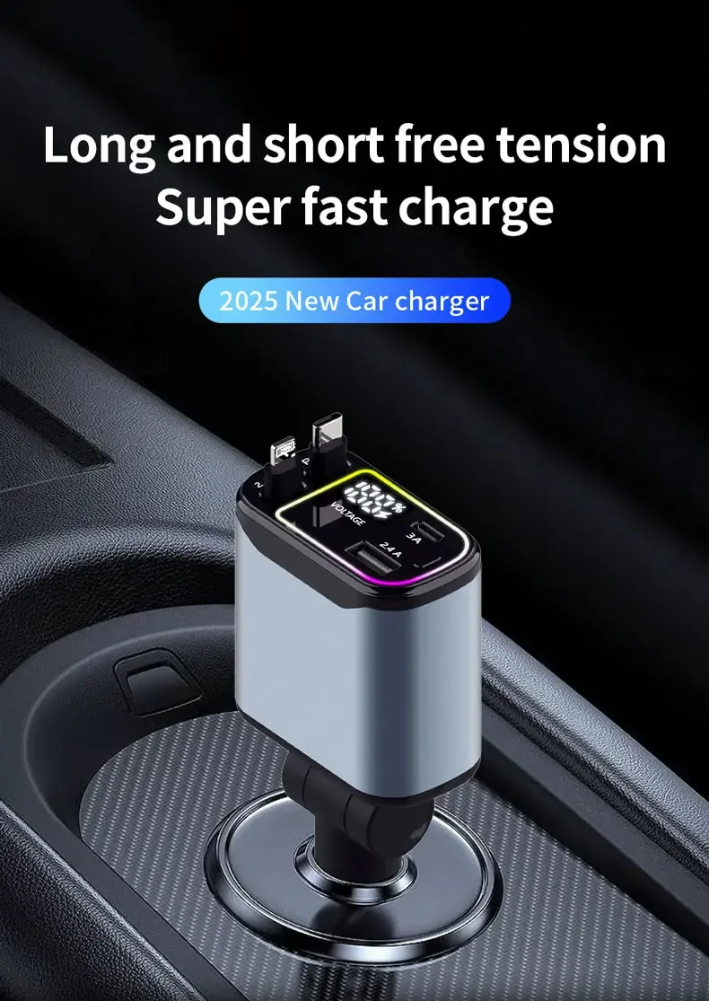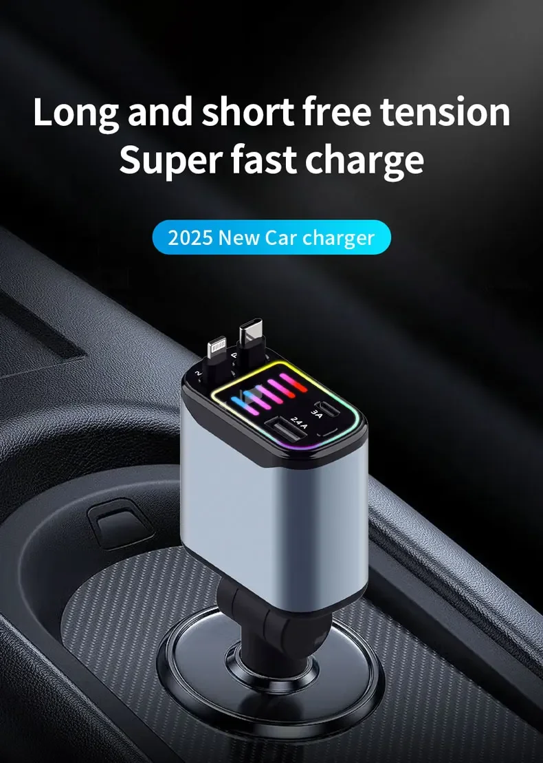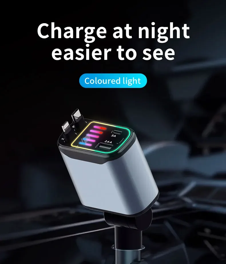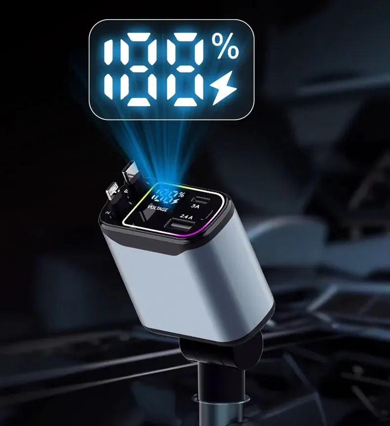 Este cargador para automóvil ofrece cuatro puertos USB y un adaptador para encendedor de cigarrillos tipo C, lo que brinda opciones de carga versátiles para múltiples dispositivos.