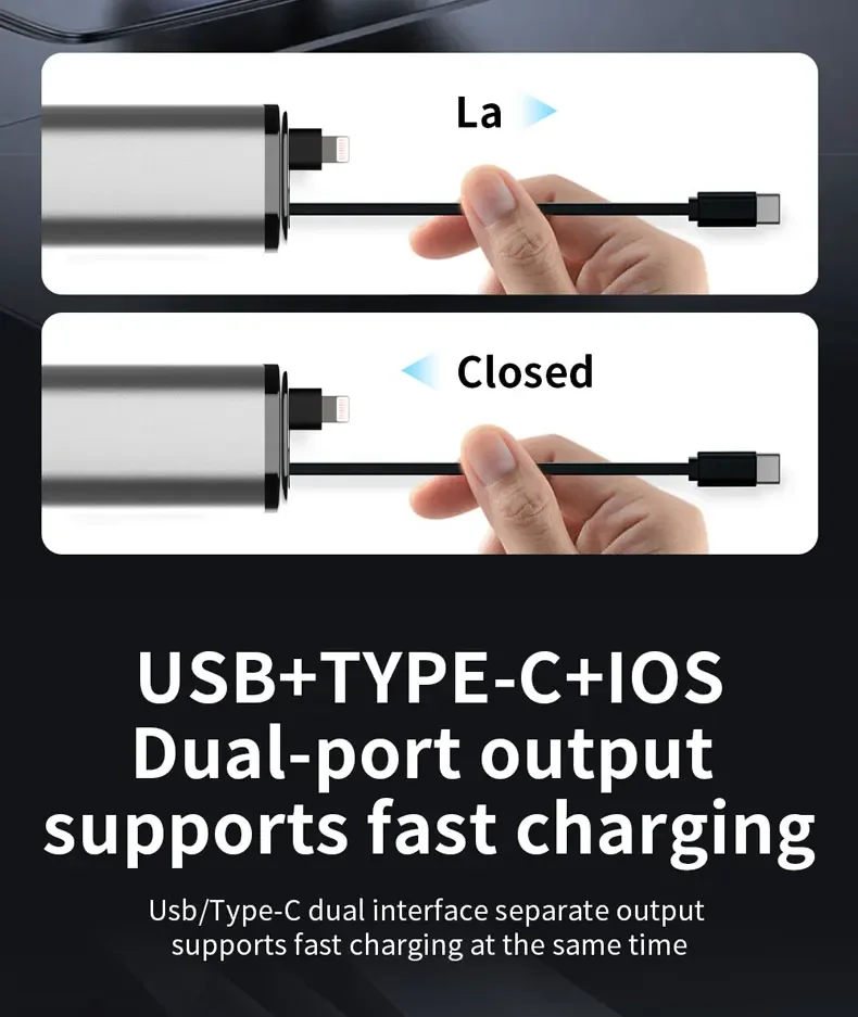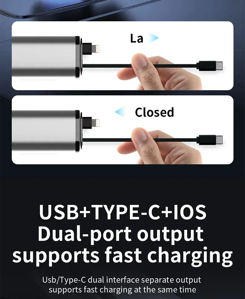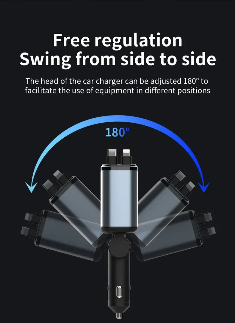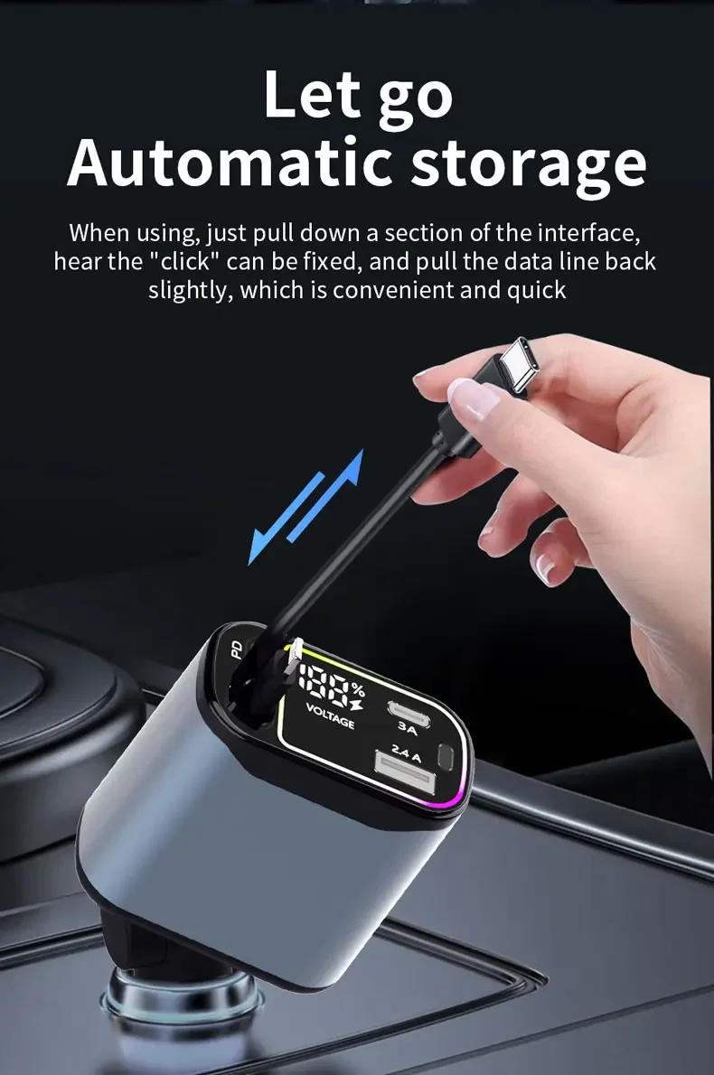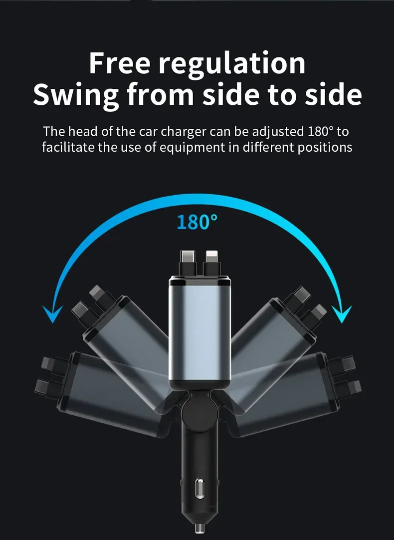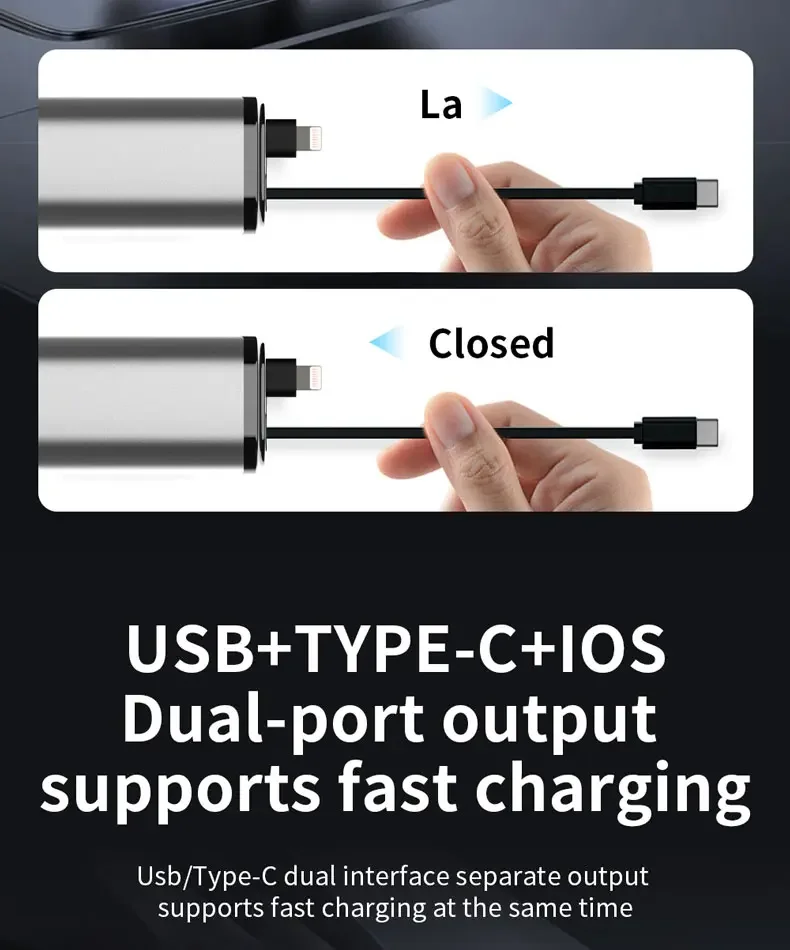 El diseño del cable retráctil garantiza un uso sin enredos, lo que lo hace conveniente para una carga rápida mientras viaja.