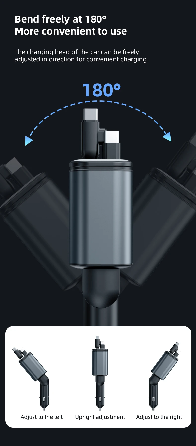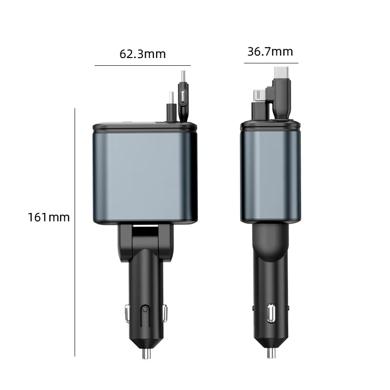 3.Diseño flexible y extensible: nuestro adaptador de corriente para automóvil está diseñado con un cable de datos flexible y extensible que puede alcanzar hasta 800 mm.Esta característica permite a los usuarios ajustar la longitud del cable para satisfacer sus necesidades, garantizando un uso cómodo del dispositivo mientras se carga.