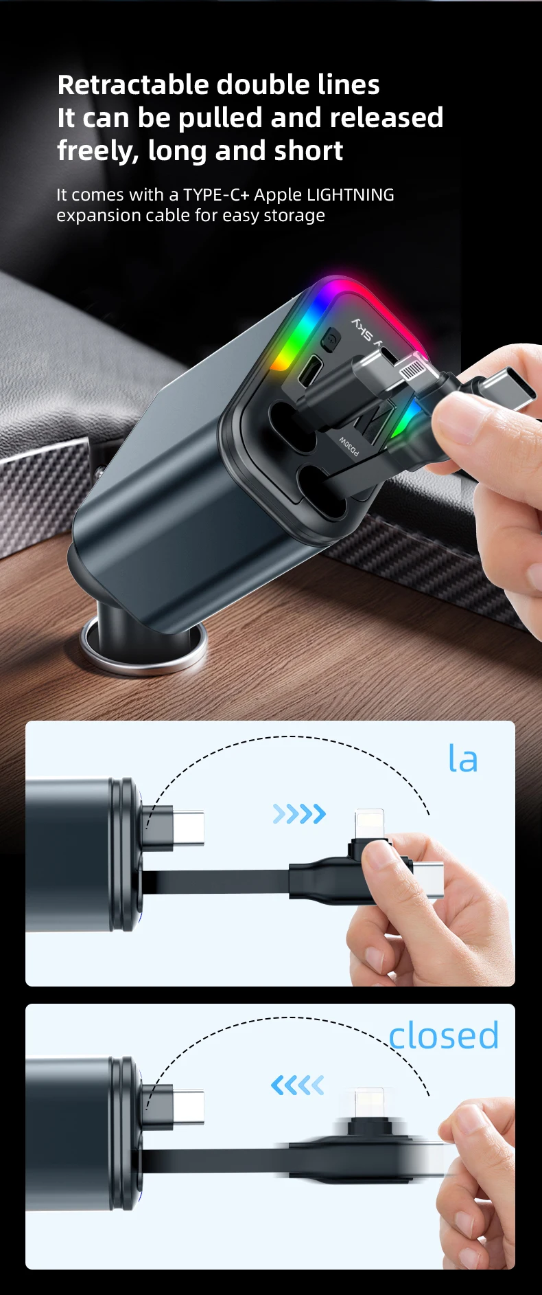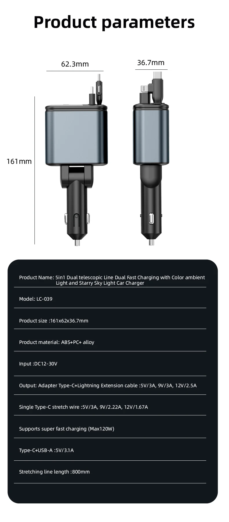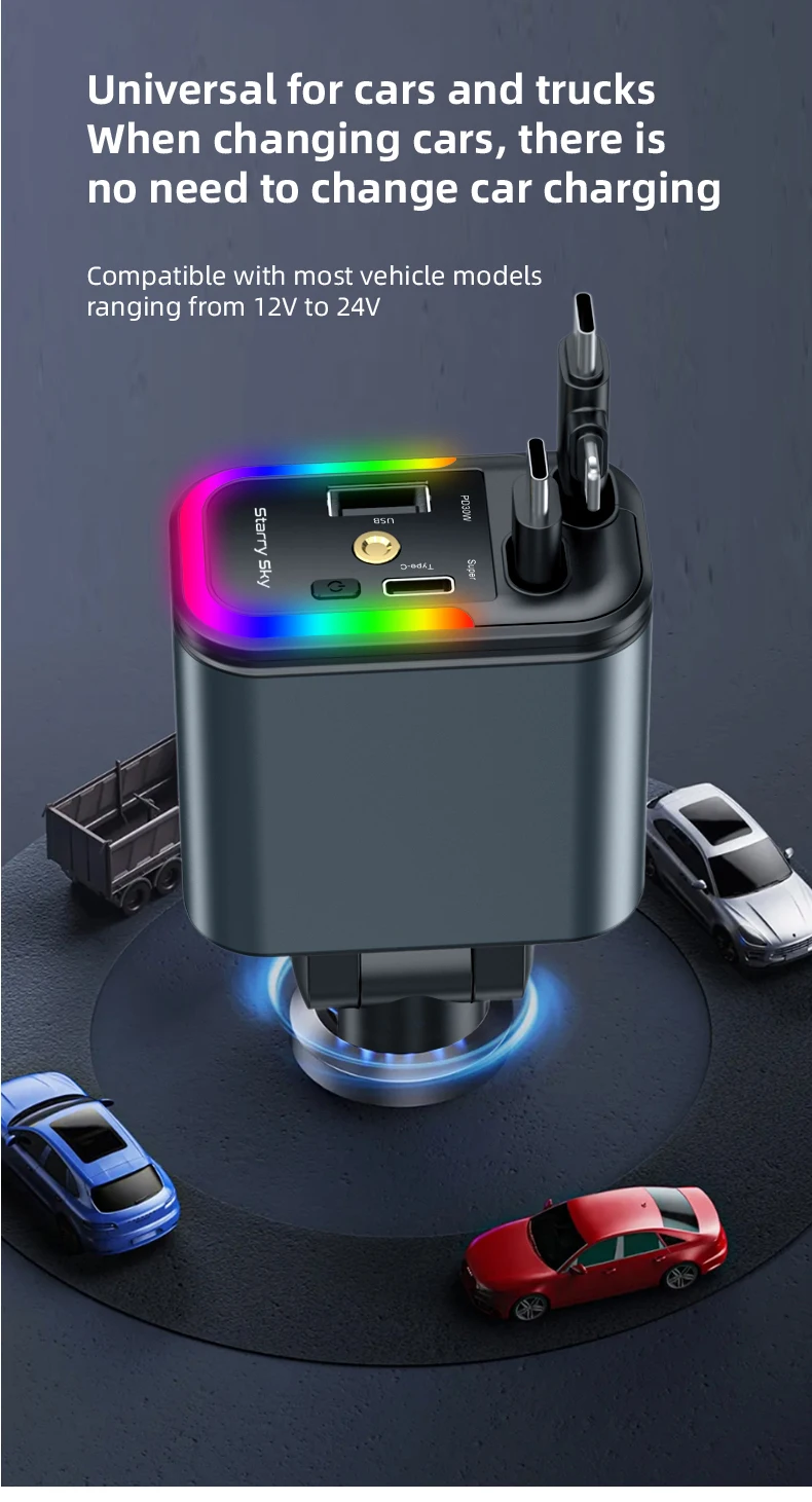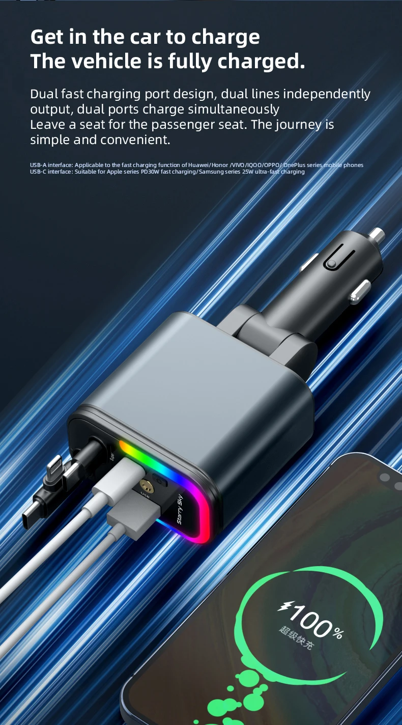 1.Puertos USB duales e interfaz de cable telescópico: nuestro cargador rápido para automóvil cuenta con puertos USB duales y una interfaz de cable expandible, lo que le permite cargar varios dispositivos simultáneamente.Esta característica garantiza que pueda mantener sus dispositivos encendidos mientras viaja.