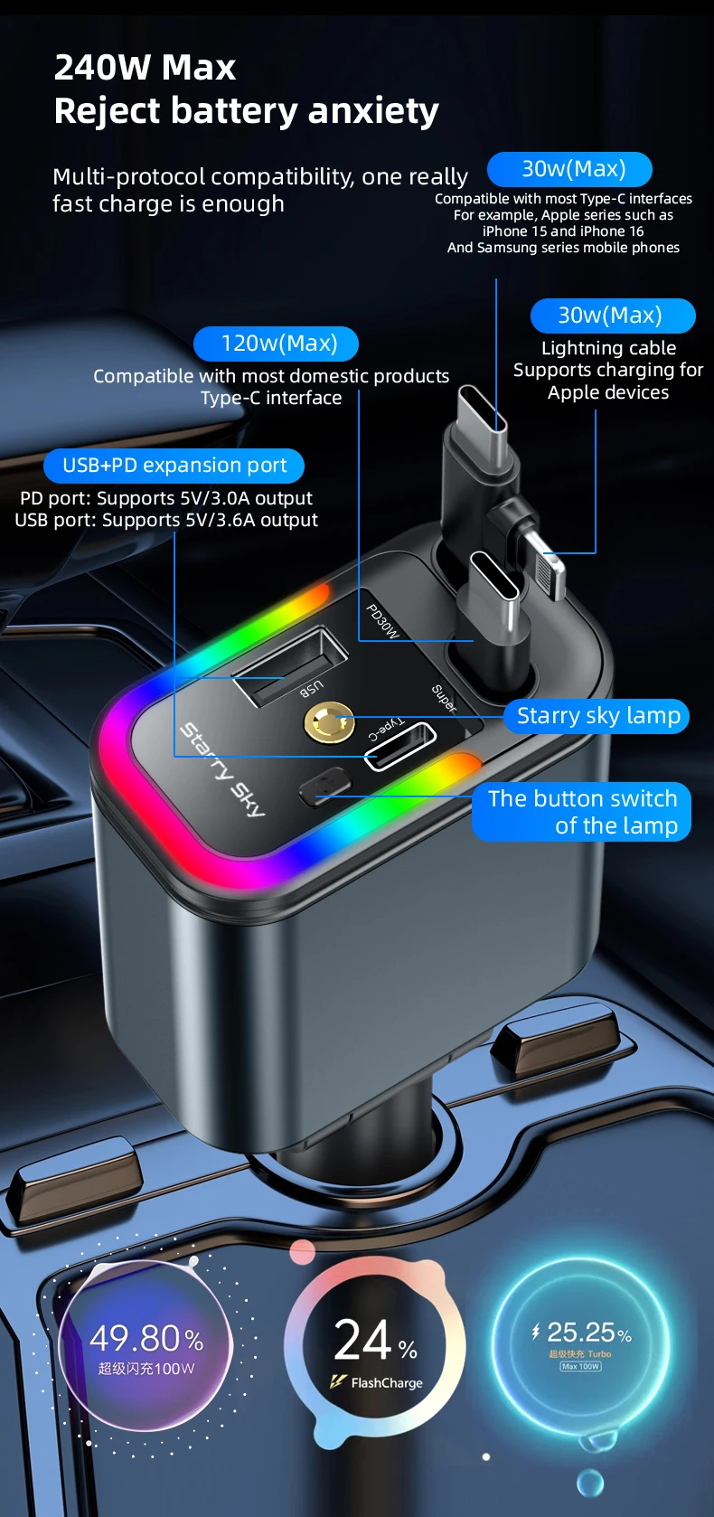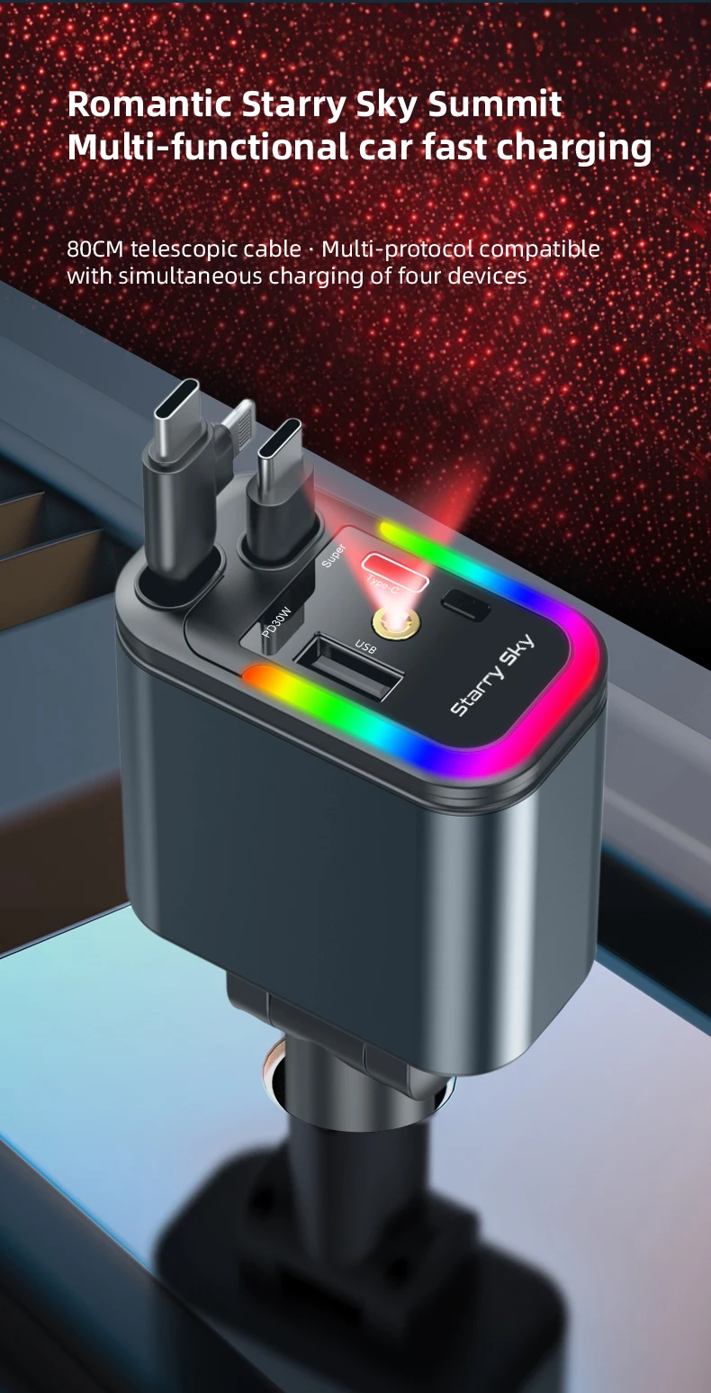 Comprar Cargador de coche de carga rápida de doble línea retráctil 5 en 1 de 180W con luz ambiental colorida y luz de cielo estrellado para iPhone Android