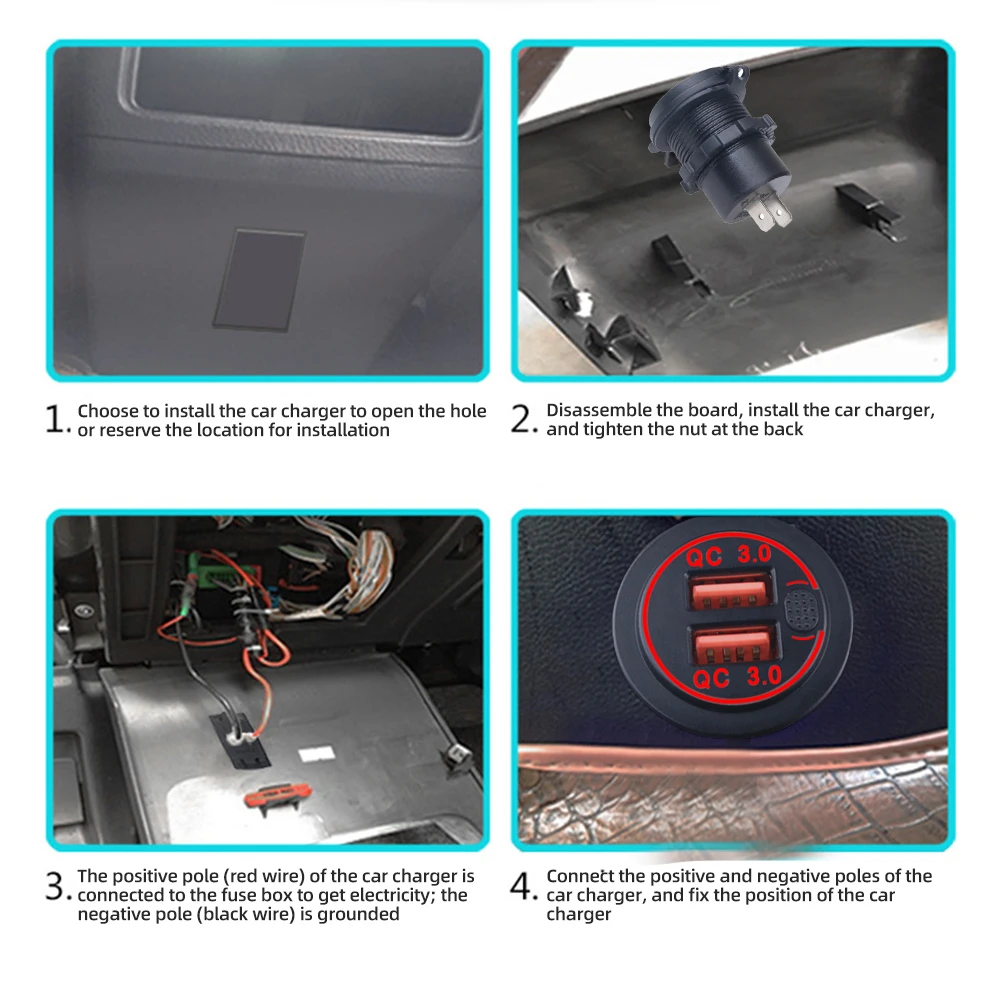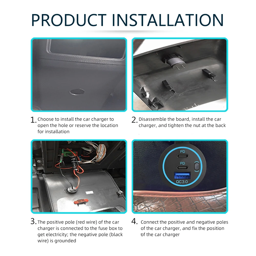 6.Protección contra ondas repentinasInstalación del producto:1.Seleccione la posición de instalación del cargador de automóvil para abrir el orificio o mantener la posición de instalación.