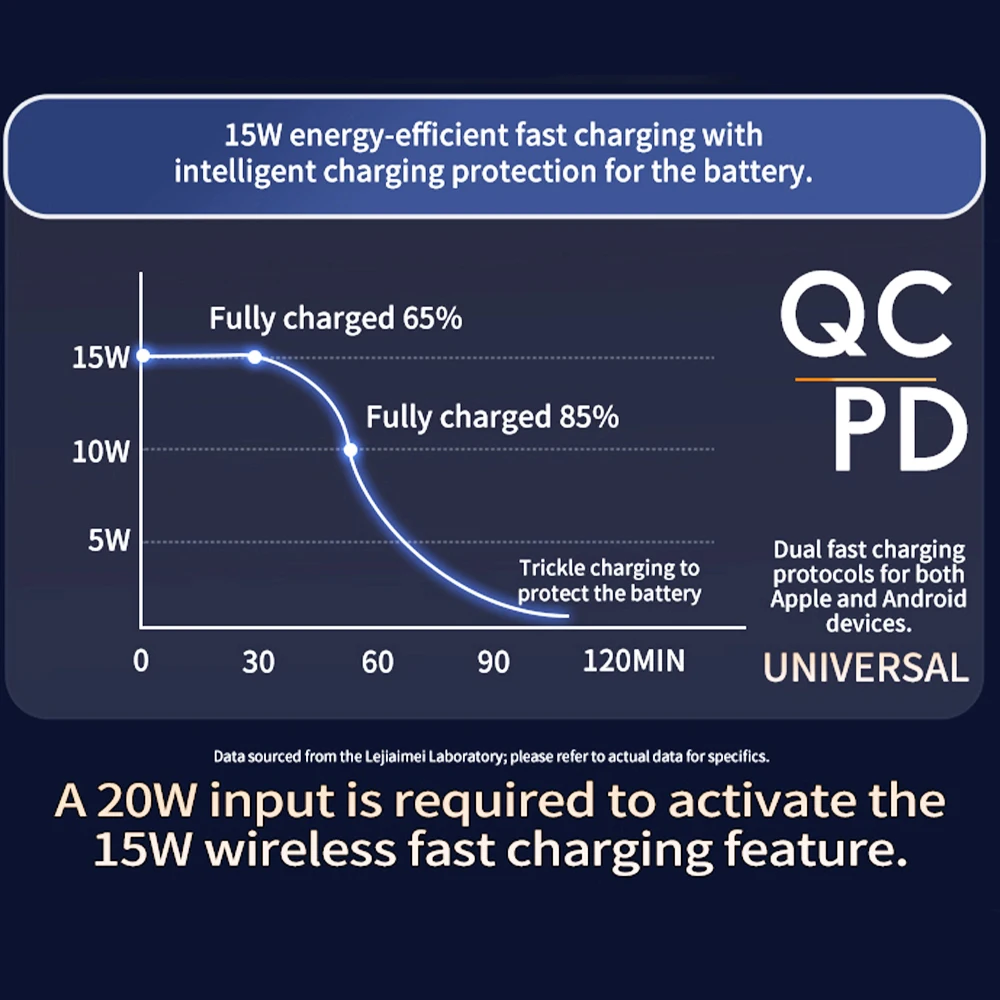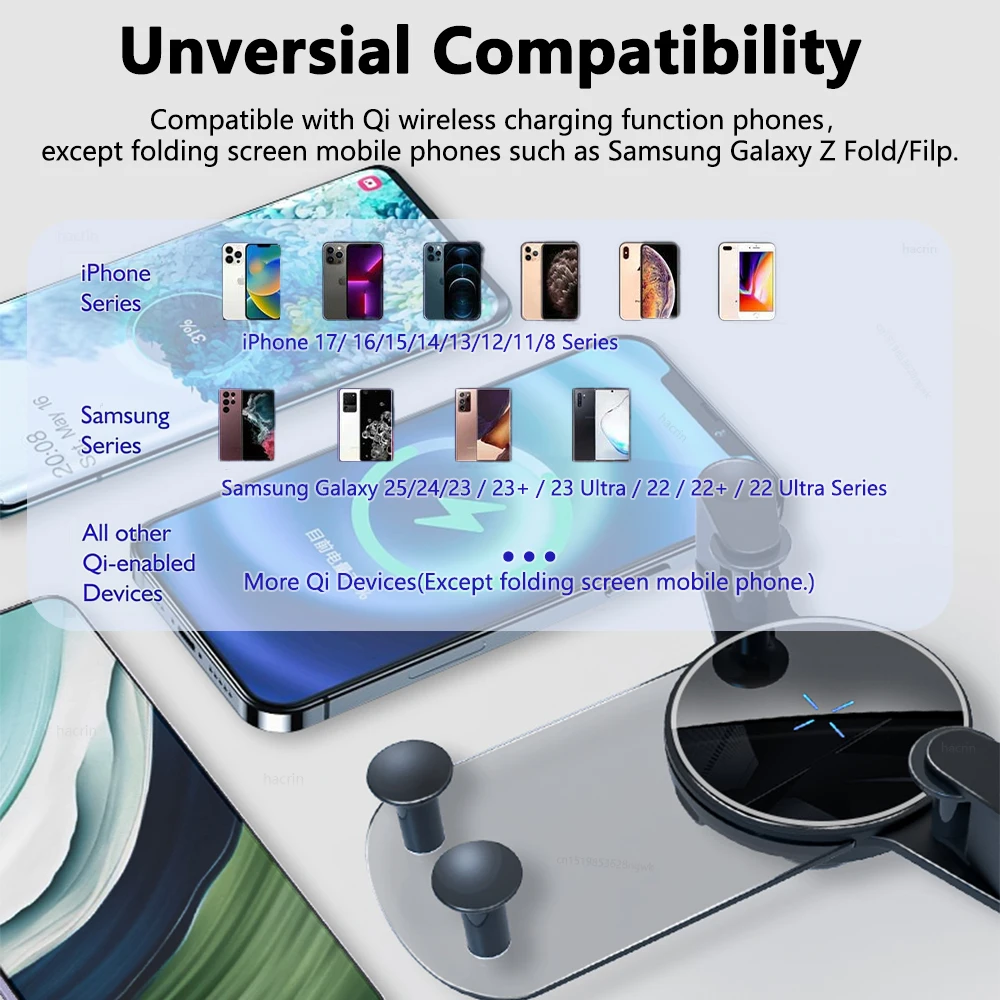 [Cargador inalámbrico rápido Qi de 15 W]El chip de carga rápida garantiza que su dispositivo Qi se pueda cargar de forma inteligente y segura a la velocidad más rápida.El cargador es compatible con todos los teléfonos móviles con función de carga inalámbrica, como iPhone 17/16/15/14/13/12/11/8, Samsung Galaxy 25/24/23+/23 Ultra/22+/22 Ultra, y no admite teléfonos móviles con pantalla plegable como Samsung Galaxy Z Fold/Filp.
