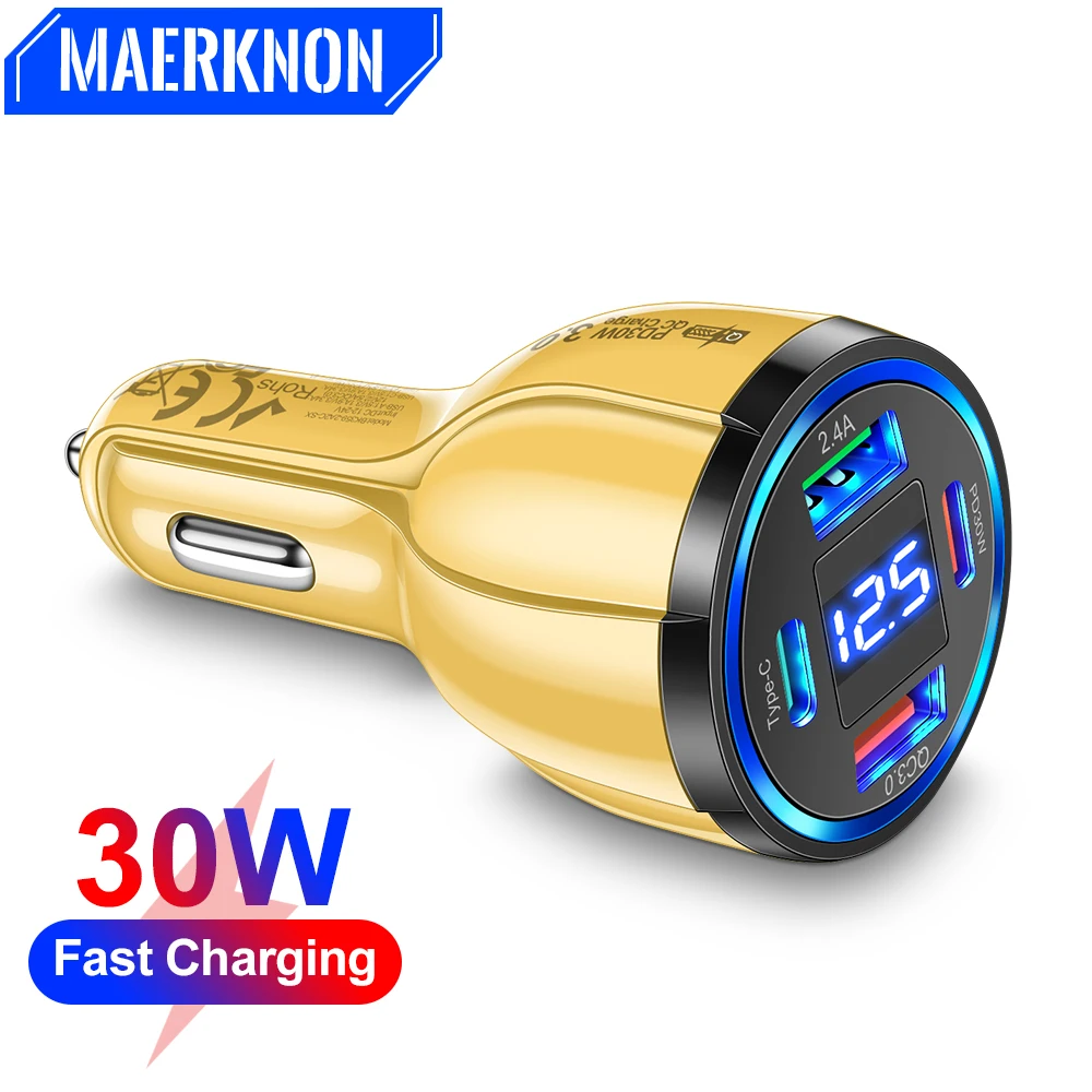 Comprar Cargador de coche PD de 30W, 4 puertos de carga rápida PD QC 3,0 USB C, adaptador tipo C para iPhone, Samsung, Xiaomi, Huawei