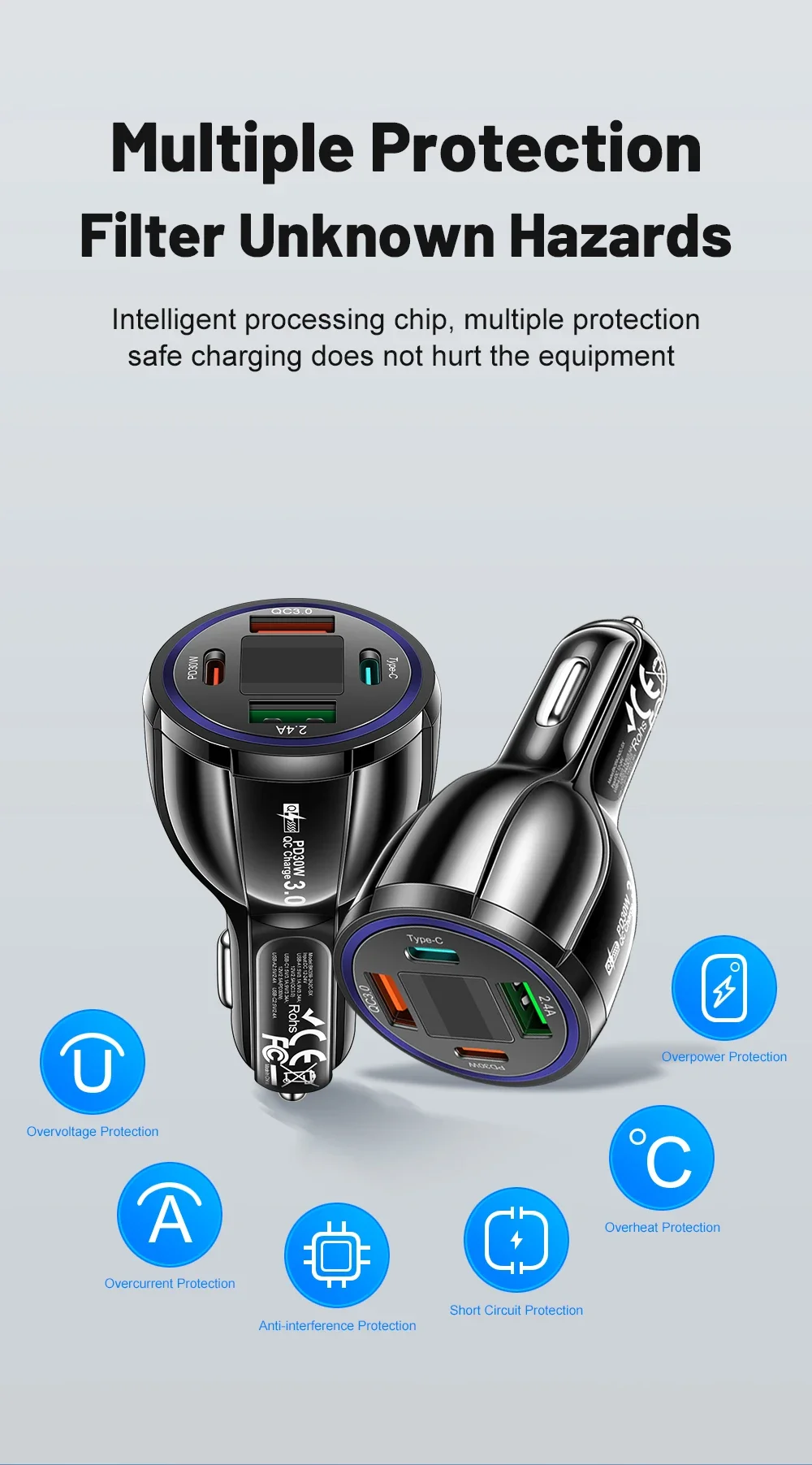 1.Salida de alta potencia de 30 W: este cargador USB para automóvil tiene una potencia de salida de hasta 30 W, lo que significa que puede cargar rápidamente varios dispositivos al mismo tiempo, incluidos teléfonos móviles, auriculares, relojes de pulsera, etc.