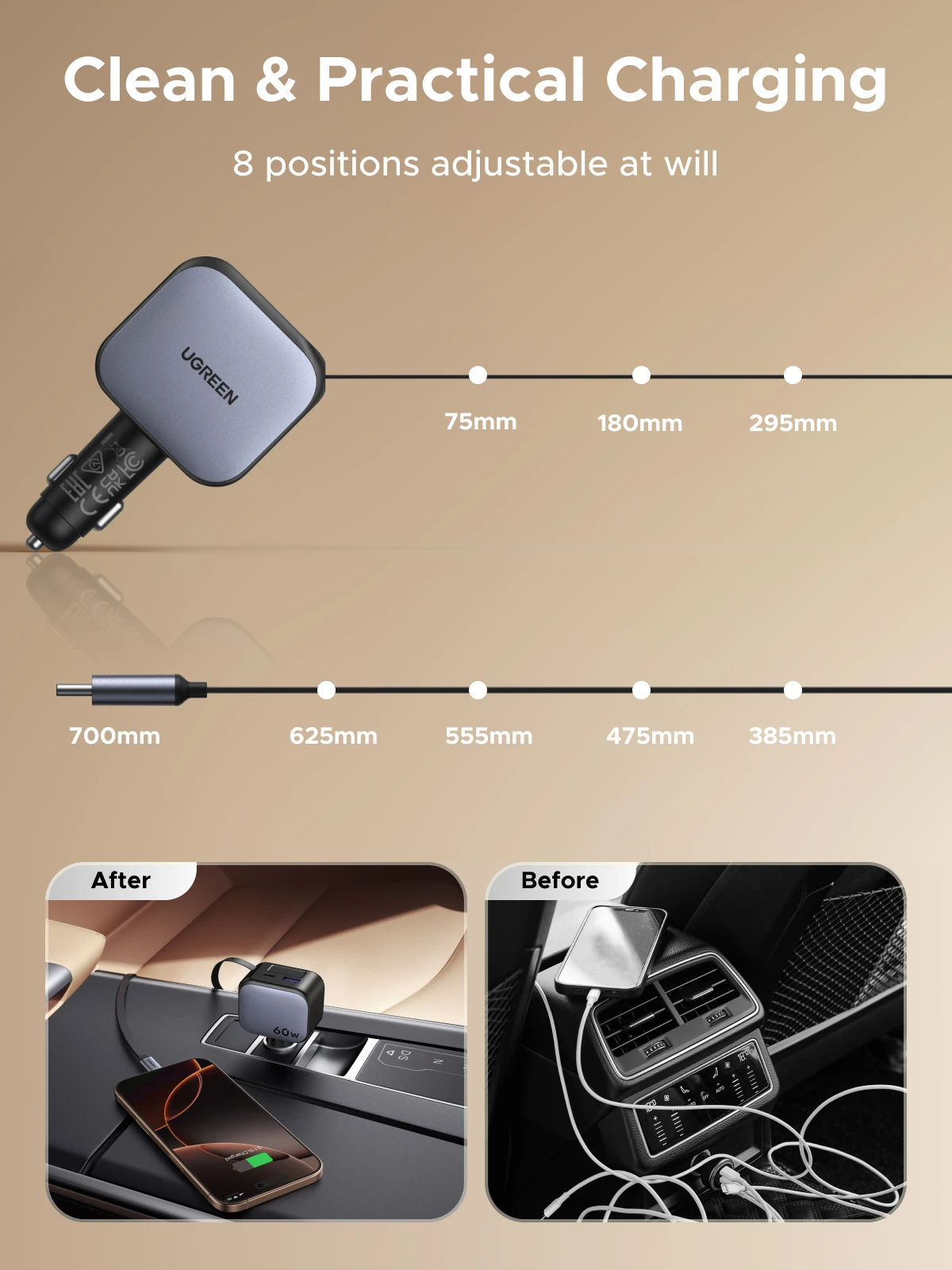 Cargador de coche retráctil UGREEN 60W carga rápida para iPhone Samsung cargador de coche para teléfono móvil