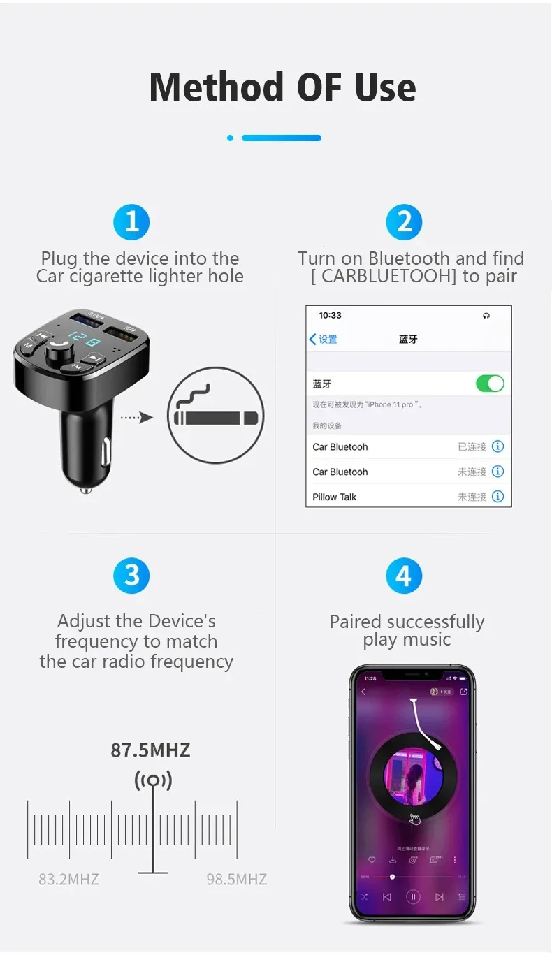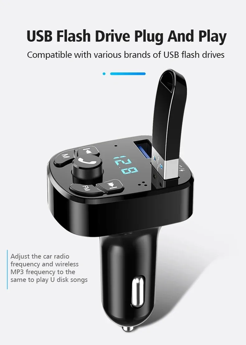 9.Tecnología de transmisión inalámbrica FM de frecuencia completa, que puede leer directamente archivos de audio en