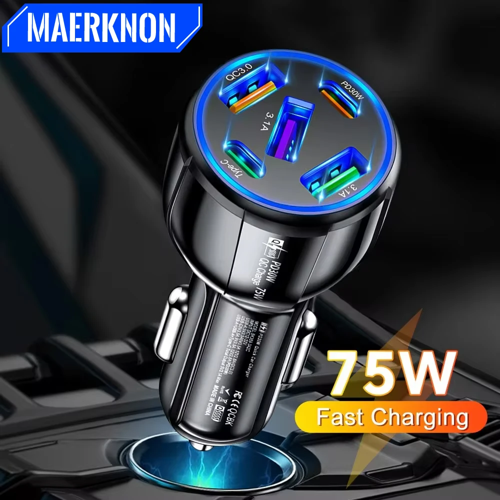 Cargador de coche USB de 5 puertos, 75W, PD tipo C, cargador de carga rápida en coche para iPhone, Samsung, Xiaomi, Huawei, teléfono, adaptador de corriente USB para coche