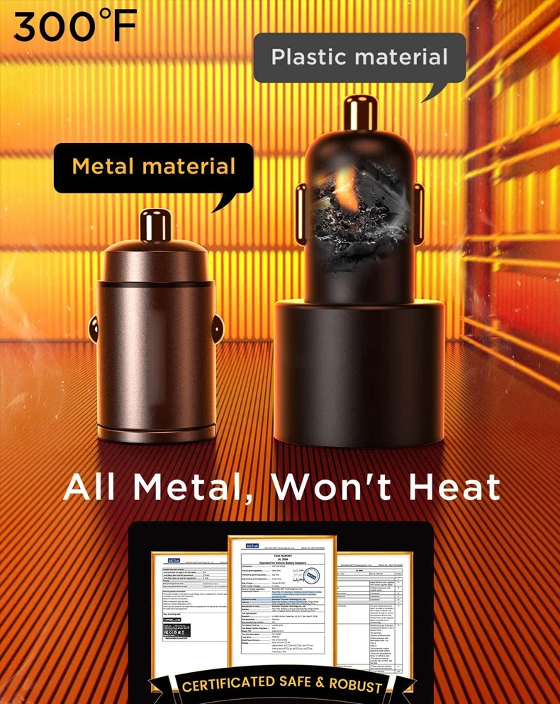 ��TODA LA PROTECCIÓN DE METAL DE ALEACIÓN DE ZINC: un cuerpo de metal bien construido brinda una sensación resistente muy elegante en comparación con el plástico habitual. El material metálico proporciona una mejor disipación del calor, resistencia a los arañazos, diseño atractivo. Con múltiples certificaciones de seguridad y un IC inteligente incorporado, el cargador de coche USB C de carga rápida puede evitar sobrecorriente, cortocircuito, sobretensión, bajo voltaje, exceso de temperatura, Y overpower para proteger su dispositivo.