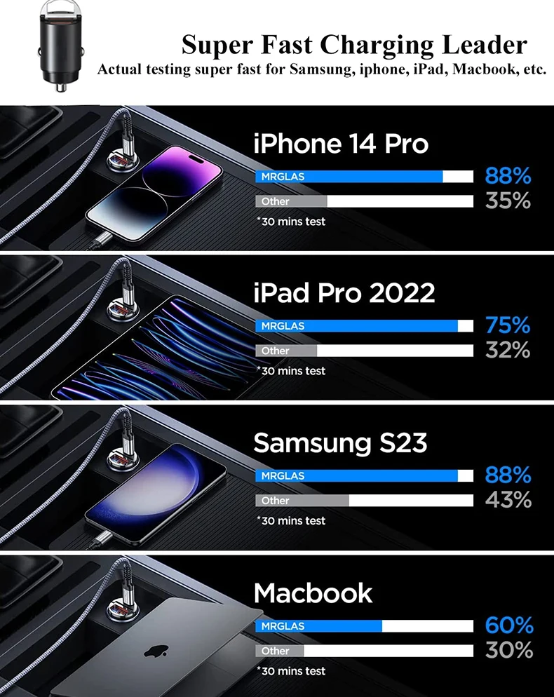 ⚡CARGA RÁPIDA PD30W + QC30W APROBADA OFICIALMENTE: Cargador de coche USB C superrápido compatible con PD 30W (puerto usb-c) y QC 30W (puerto usb-a) de alto rendimiento, puede cargar rápidamente todos los teléfonos/iPad/tabletas predominantes al mismo tiempo. Hace que el IPhone 14 Pro Max y Samsung Galaxy S22 tiempo de carga de 0% a 88% en 30 minutos.