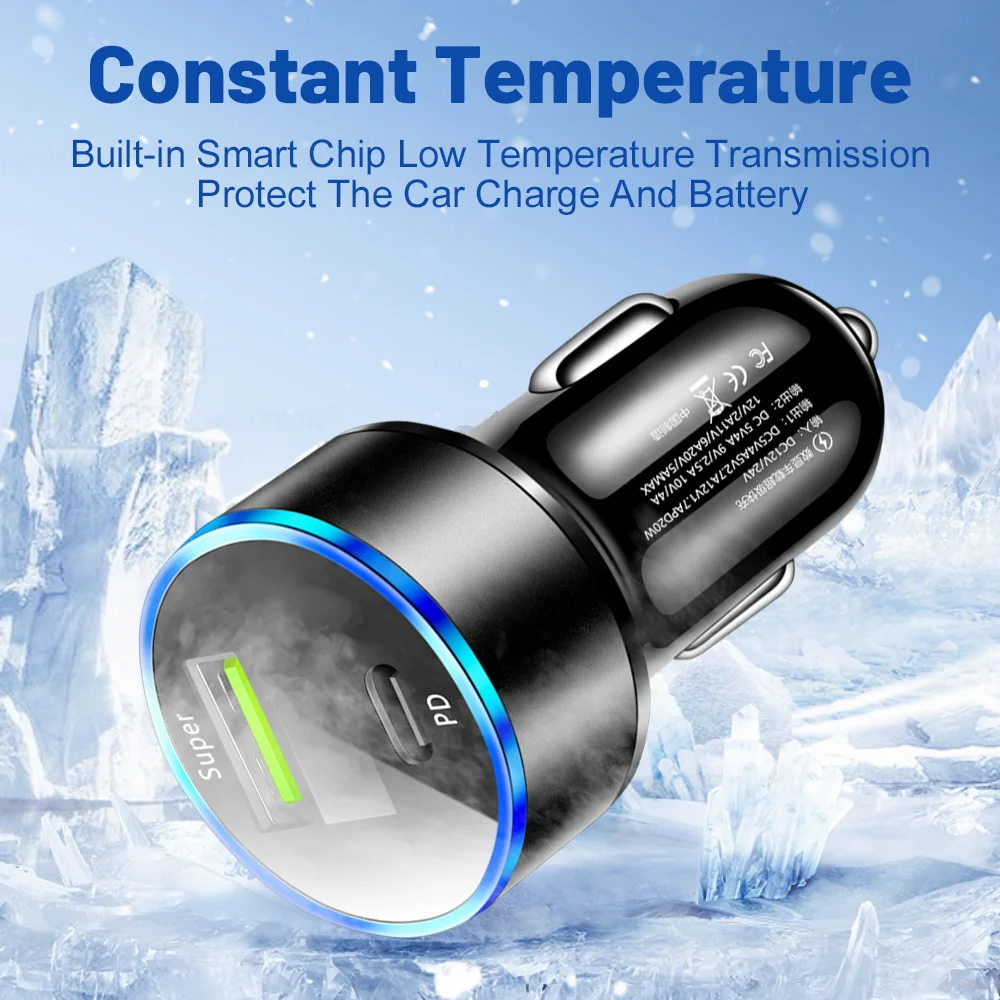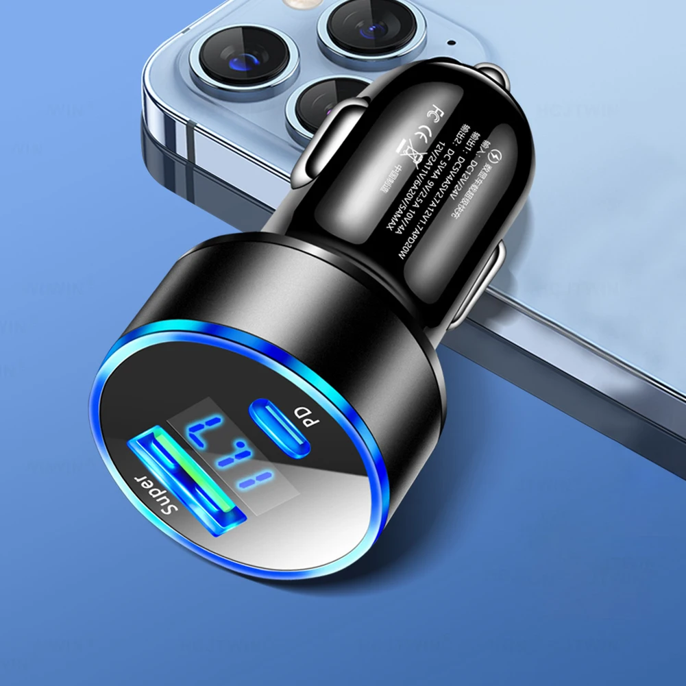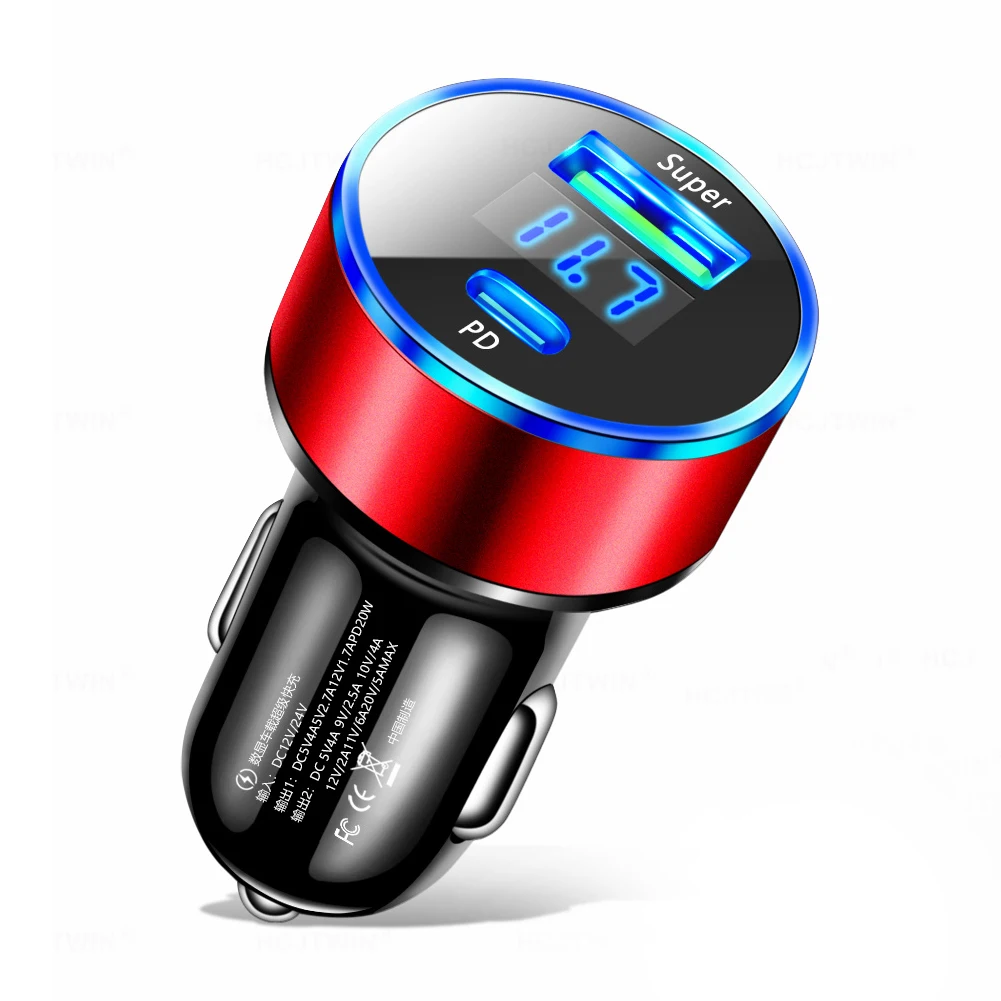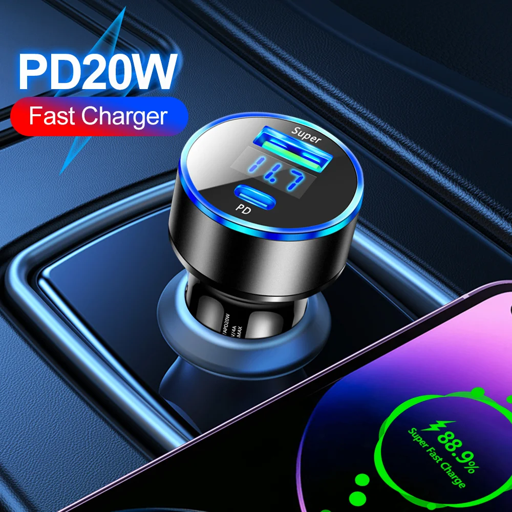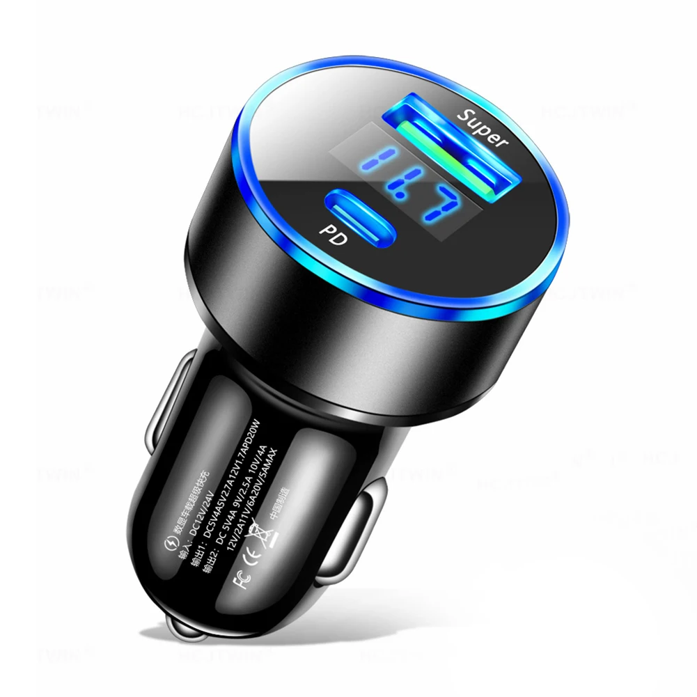 Adaptador de cargador de teléfono automático de 20W USB 3,0 PD tipo C 2 puertos cargador automático con pantalla Digital resistencia al calor para iPhone 14 13 Pro Max/Xiaomi/Samsung