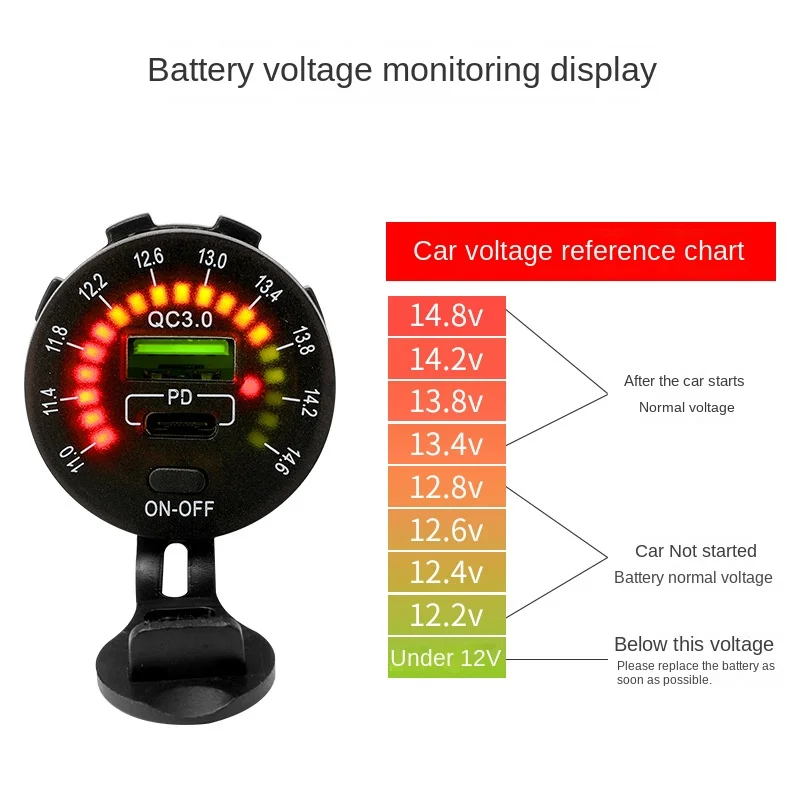 Equipado con un colorido voltímetro LED integrado que puede controlar la batería del vehículo y permitirle conocer el estado de la batería mientras conduce, y así evitar problemas de voltaje anormales.